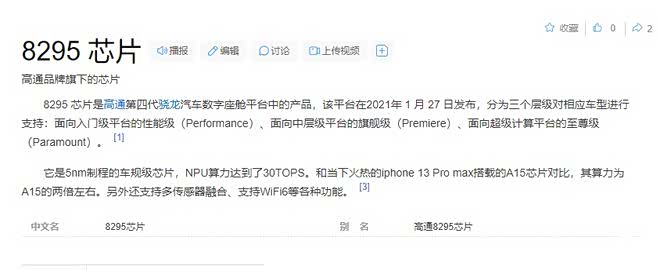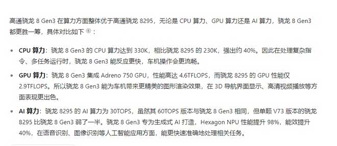 首先,要明确科普一下两者芯片,8295芯片是高通第四代汽车数字座舱专门开发的芯片,并且拢共分成了三个版本,分别是性能级、旗舰级和至尊级三个版本,是一款车规级芯片,而NPU算力达到了30TOPS,并且是5nm制程,说到底,这款芯片就是为车机量身打造的一款芯片,这么说,大家就能明白了吧!
