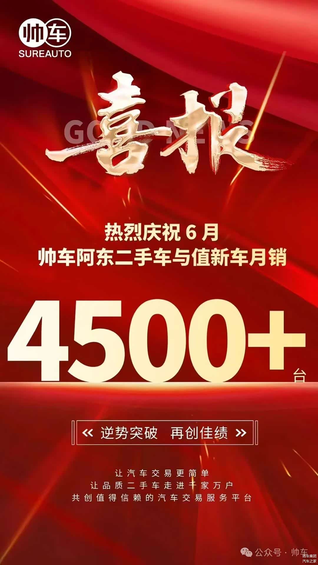 6月份帅车阿东二手车与值新车月销量突破4500台,逆势突破,再创佳绩。同时集团线上流量矩阵覆盖2000万用户,100+矩阵账号形成高效获客网络,线上线下融合模式推动其市场份额持续扩大。