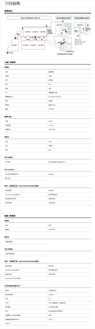 上次我去成都车展的时候,我只在丰田的站台看到了一点点有关汽车技术,或者汽车零部件的展台。但东京车展不一样,比如下图这是我把东京车展官网的一个车展指南页做了一个长图。
