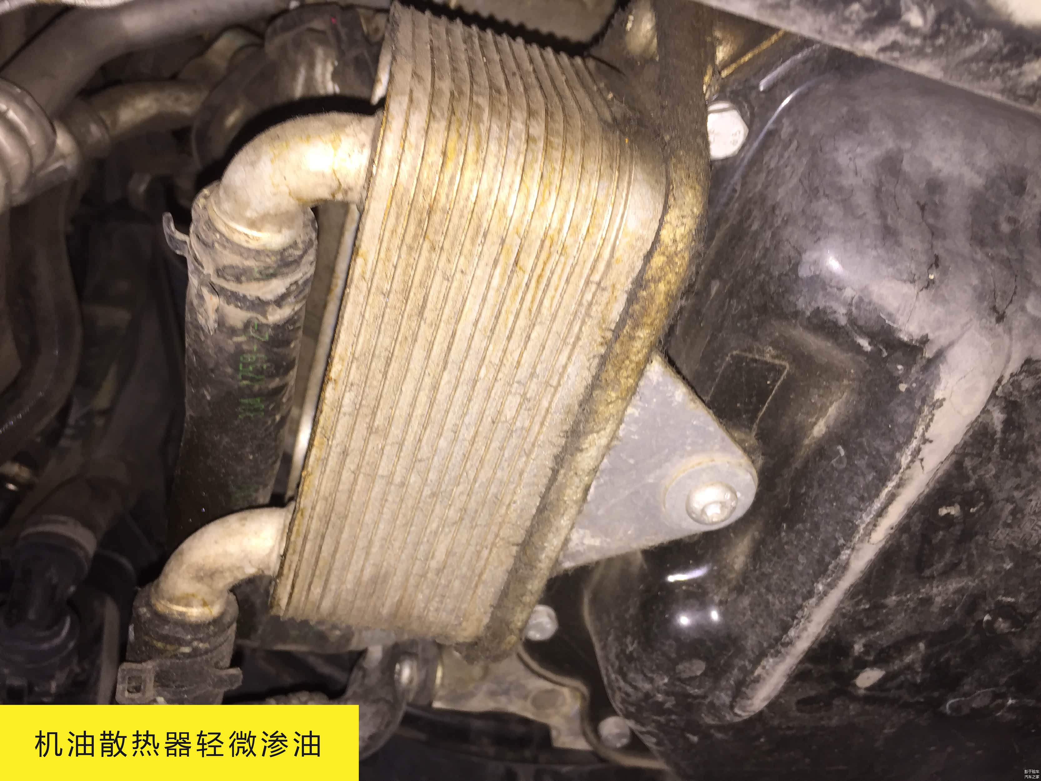 机油散热器上吸附着一层油泥,但并没有找到明显的渗油或漏油点,应该属于最初级的洇油情况,完全没有维修的必要。
