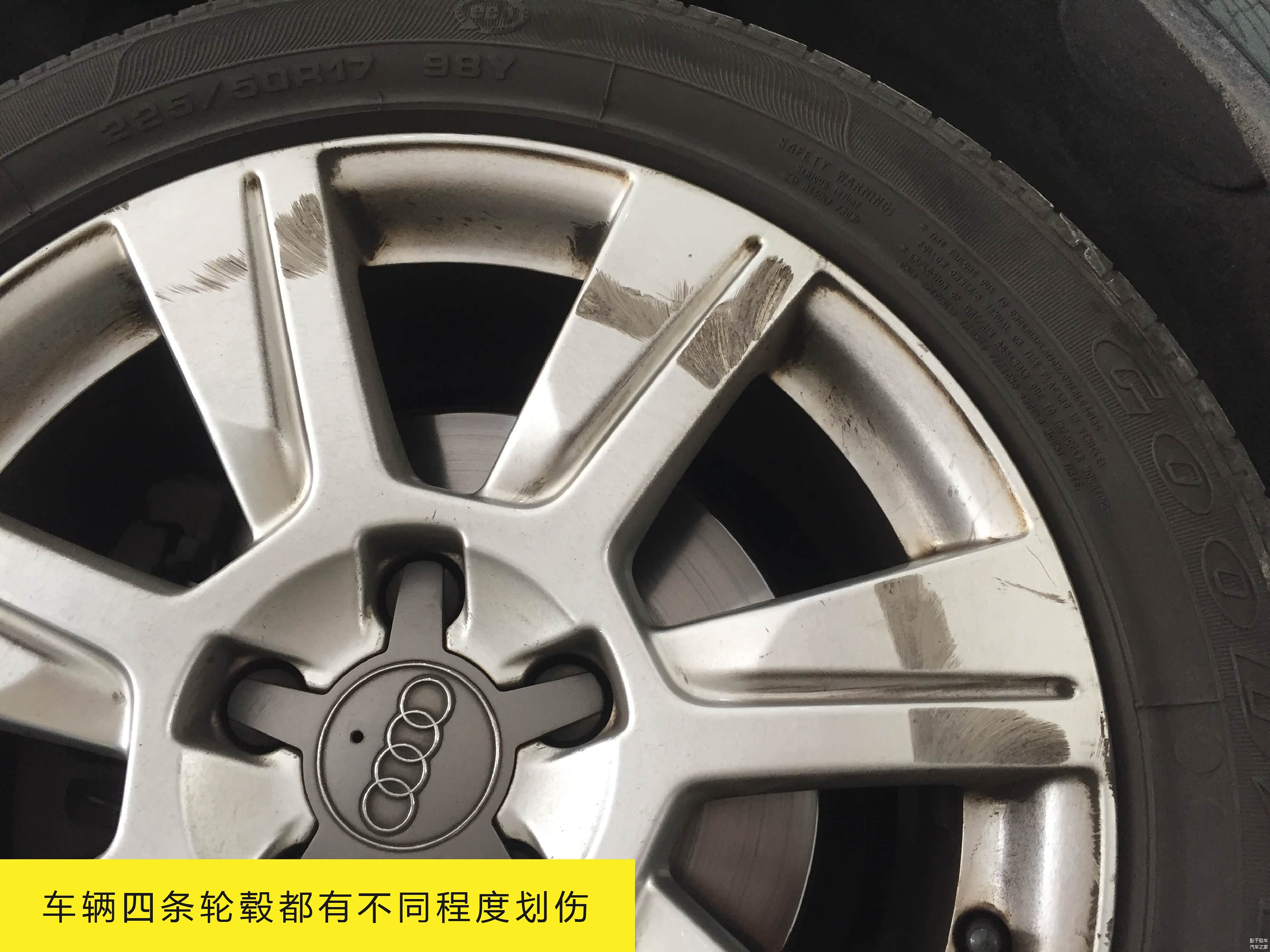 车辆四条轮毂都有不同程度的划伤,但上图中已经属于最严重的一块了,如果客户想对轮毂进行修复,汽车美容店的费用大概是200元一块。