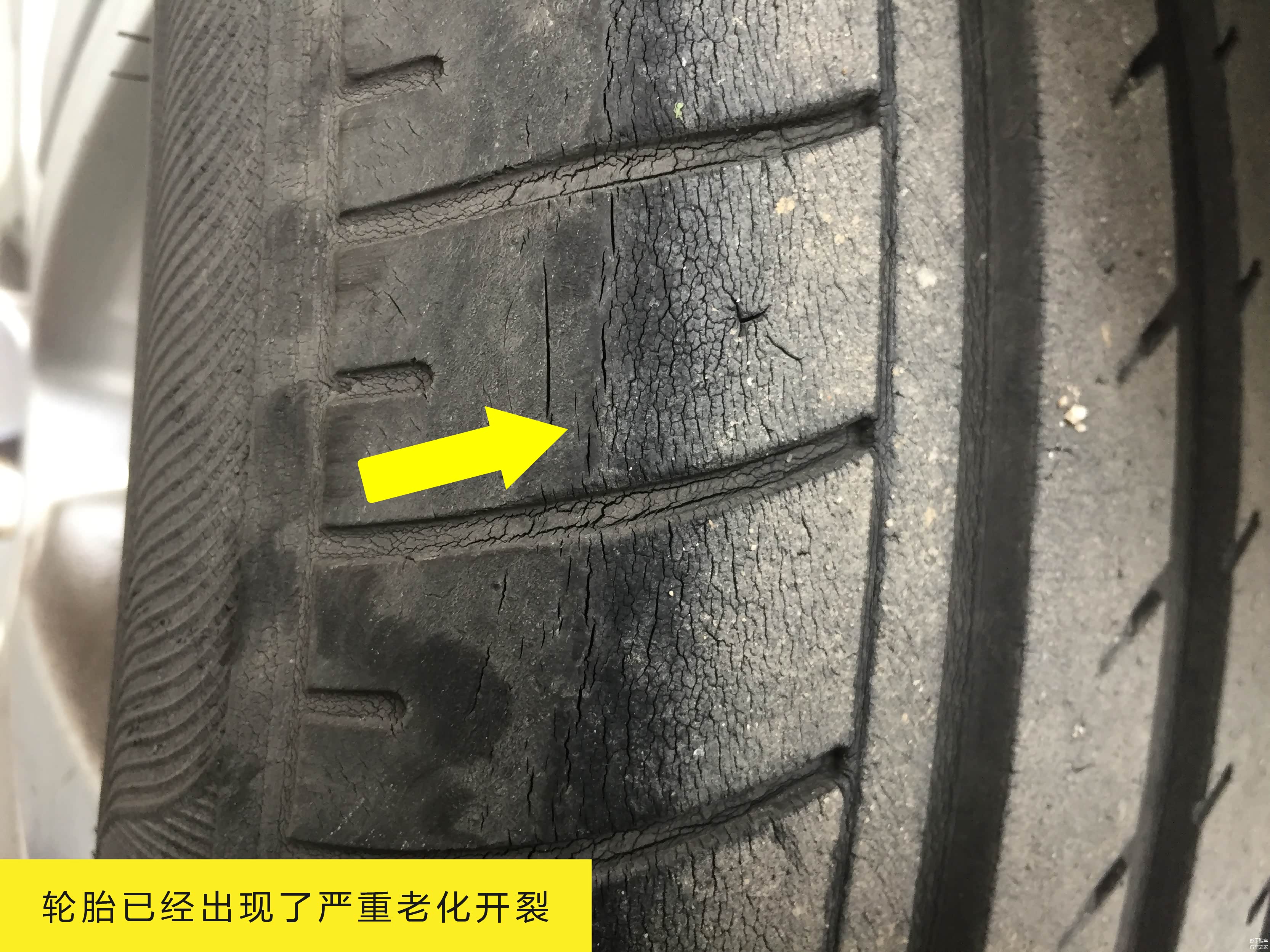 轮胎的受力面边缘已经出现了较严重的老化开裂,建议客户购车后及时进行两条后轮的更换。