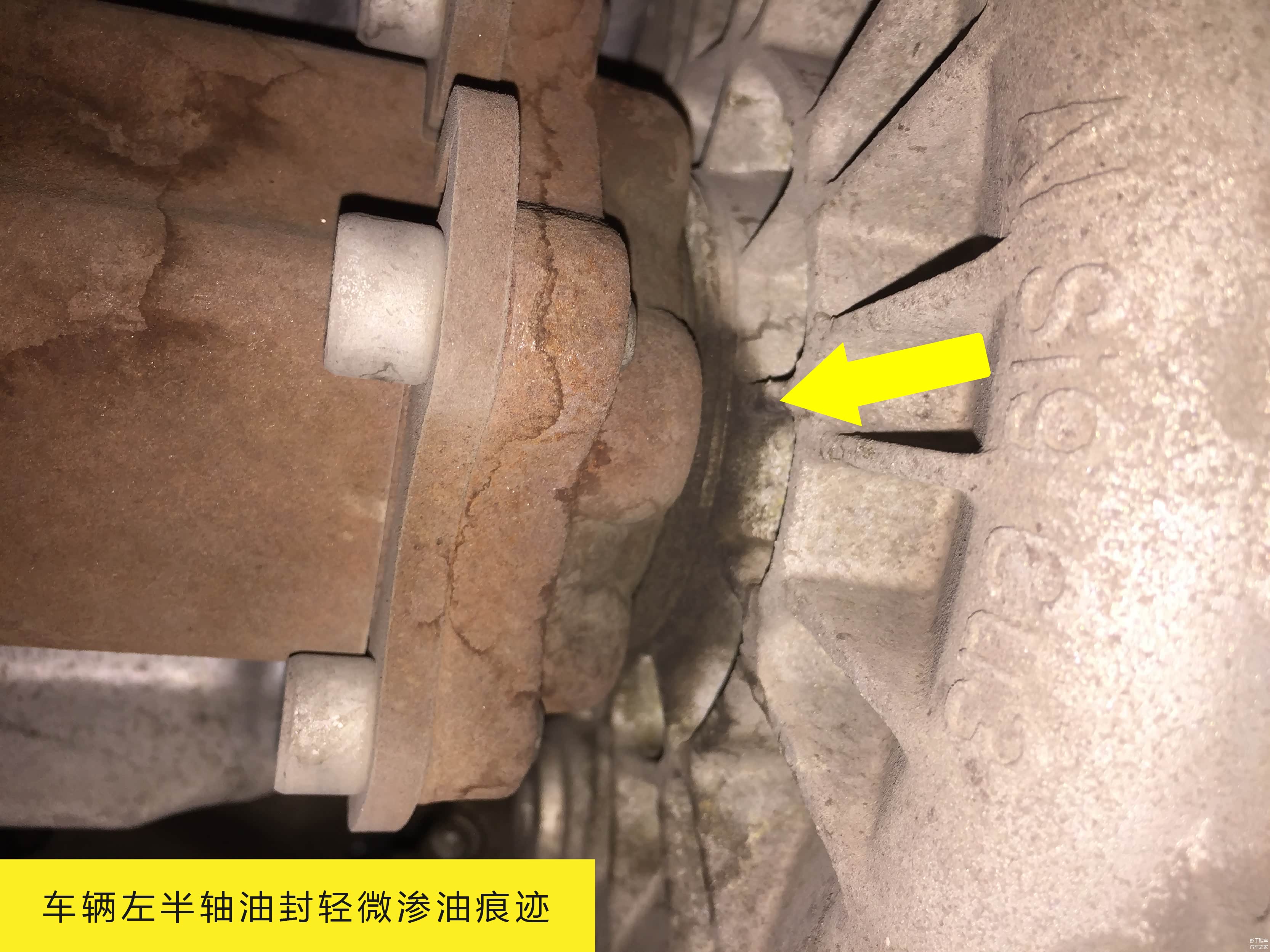 左前半轴油封存在极轻微的渗油,不要忘记车辆已经有12.5万公里的里程,这种程度的渗油我想90%的客户都能理解,即使是同车龄、里程数的日系车情况也差不多!