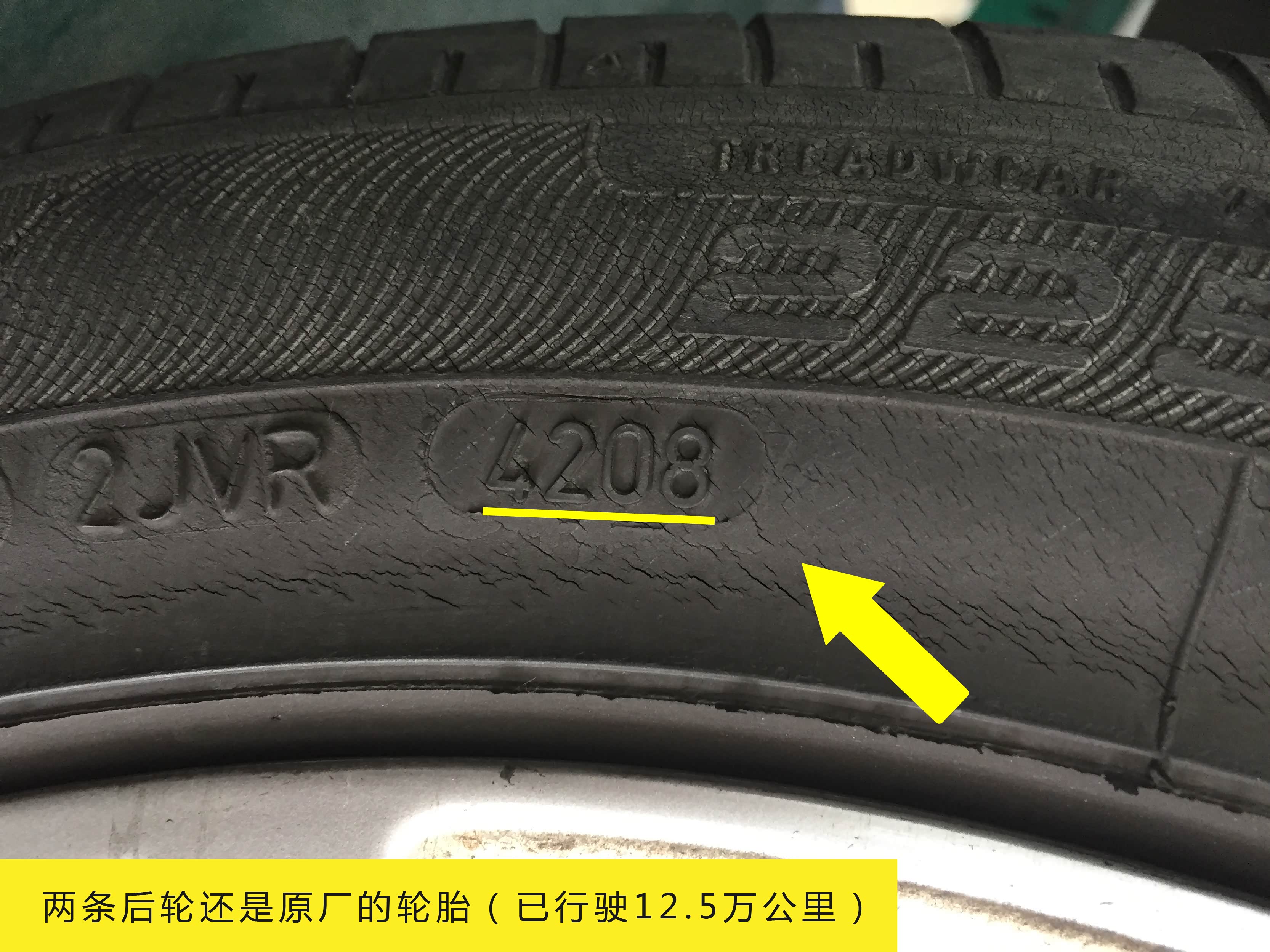 在检测轮胎时惊奇的发现两条后轮都是原厂胎,上图箭头处的“08”代表年份,前面的“42”代表当年的第几周所生产的。所以这条轮胎大致是2008年10月左右,已经行驶了12.5万公里未更换。