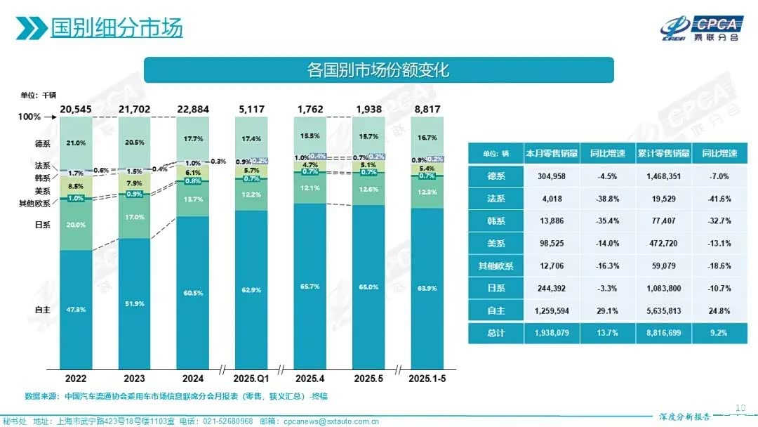 这些年,外资品牌中只剩下德系、日系扛大旗,其他派系的销量规模不断缩小,根据乘联会数据,今年1-5月,法系、韩系、美系、市场份额分别仅剩0.2%、0.9%、5.4%,很多品牌和车型已经在边缘化。