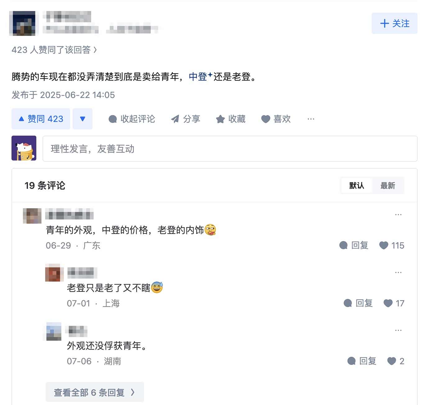 产品设计要让目标群体看着顺眼、用着舒服,其中看着顺眼又包括车标、配色、外观设计、内饰设计等诸多因素,可满足这个条件也不容易。知乎平台一位网友吐槽,腾势还没搞清楚产品到底打算卖给谁,另一位网友则回复他,腾势现在是符合年轻人审美的外观、符合中年人消费能力的价格,以及符合老年人喜好的内饰设计。