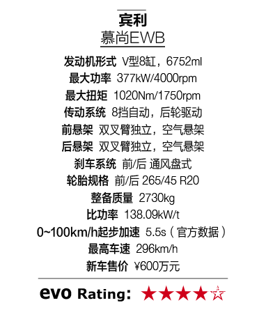 慕尚EWB依旧搭载了那经典的6¾L V8双涡轮增压发动机,这款L系列发动机不仅是宾利历史中最长寿的,也是人类历史中最长寿的,即便将各种船用发动机、航空发动机都算上,也能够排到前几位。六十余年的历史,宾利一直在探索这一系列发动机的潜能。拿宾利的话说:“即便应用了先进的闭缸技术,排放降低了99%,就轴承和缸体强度而言,还远没有达到这款发动机的极限”。与来自ZF的8挡自动变速器配合,即便慕尚EWB达到了2730kg,0~100km/h加速时间依然达到了为5.5s,城市工况油耗为23.4L/100km。