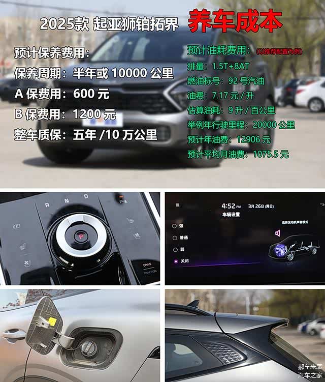 养车成本方面,新车保养周期为半年或10000公里,其中A保费用600元;B保费用为1200元。至于油耗,郝哥同样以推荐配置为例,新车的工信部综合油耗显示为7升/百公里,为了更接近真实,郝哥以再增加两个油计算,也就是9升,目前北京地区92号汽油的油价为7.17元/升,假如每年行驶20000公里,那么预计您的年油费为12906元,平均月油费为1075.5元,不知道这样的油耗水平符合您的预期么?