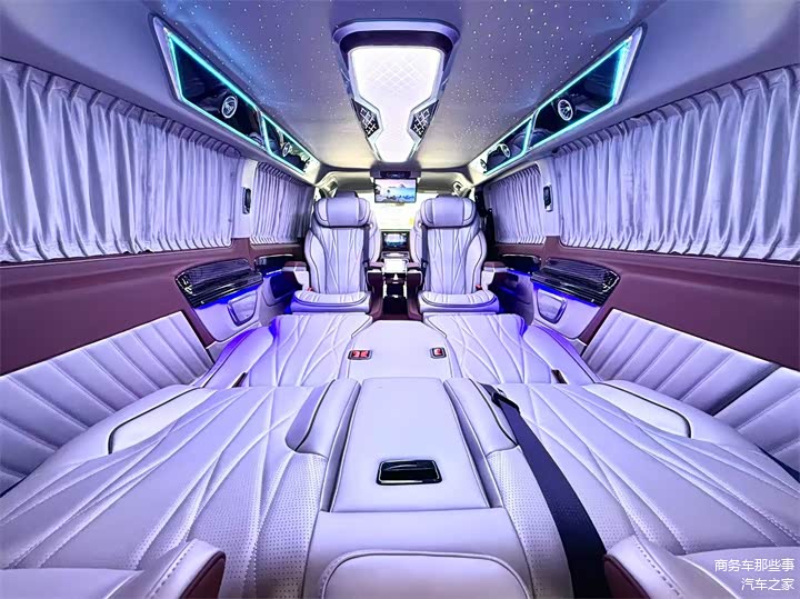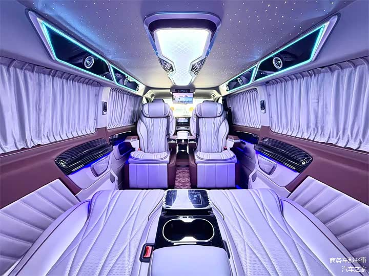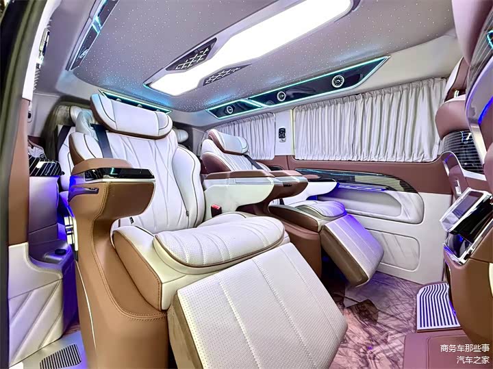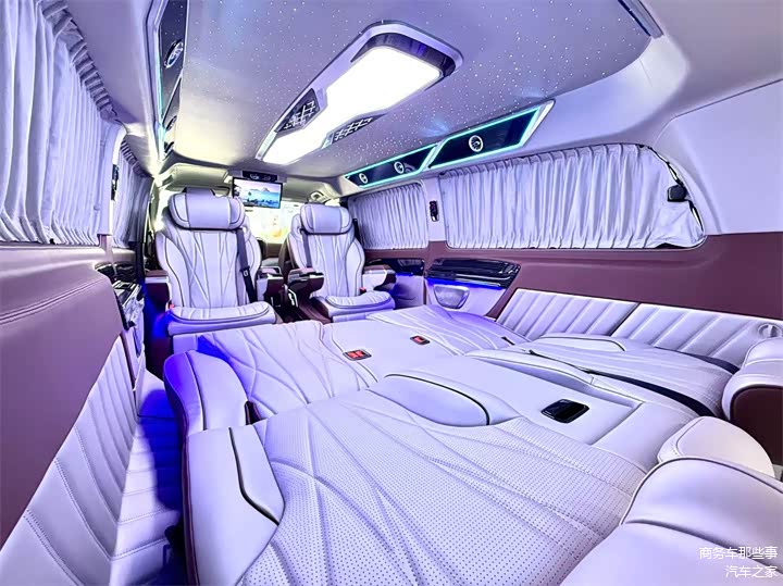 除此之外从细节方面来看也是各有特色,首先顶部是无线网络电视机,用的是吸顶的电视,增加了车里面的空间,又保留了后方的娱乐系统。顶部用的是内增高的一个大顶,它使我们的头部空间更加的宽敞,星空顶顶灯氛围灯相互搭配,氛围感又很好。地板用的是花纹的高光镜面的地板,跟车的颜色很搭配,也显高级。总的来说改装看细节,看品质,看做工,我们的改装威霆商务车拿出去绝对是能撑得住场面的,大气稳重,品质又高。那么你觉得怎么样呢?欢迎在下方点赞评论加关注,我们一起来讨论一下。