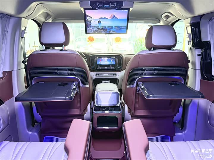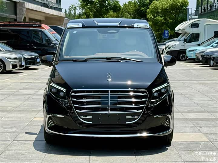 今天我们来看的这一台则是升级改装之后的车型,首先外观上改装了v300的新款大前脸,三眼皮的led大灯,加上帷幕的小高顶,以及后尾翼,侧边的电动门和电动尾门还有转向灯都有所改变。在周边上也加装了车窗镀铬条,当然如果需要更高级的改装,轮毂上也可以升级,外观上也有多款可以选择。我们进入到内饰去看一下有什么不一样。