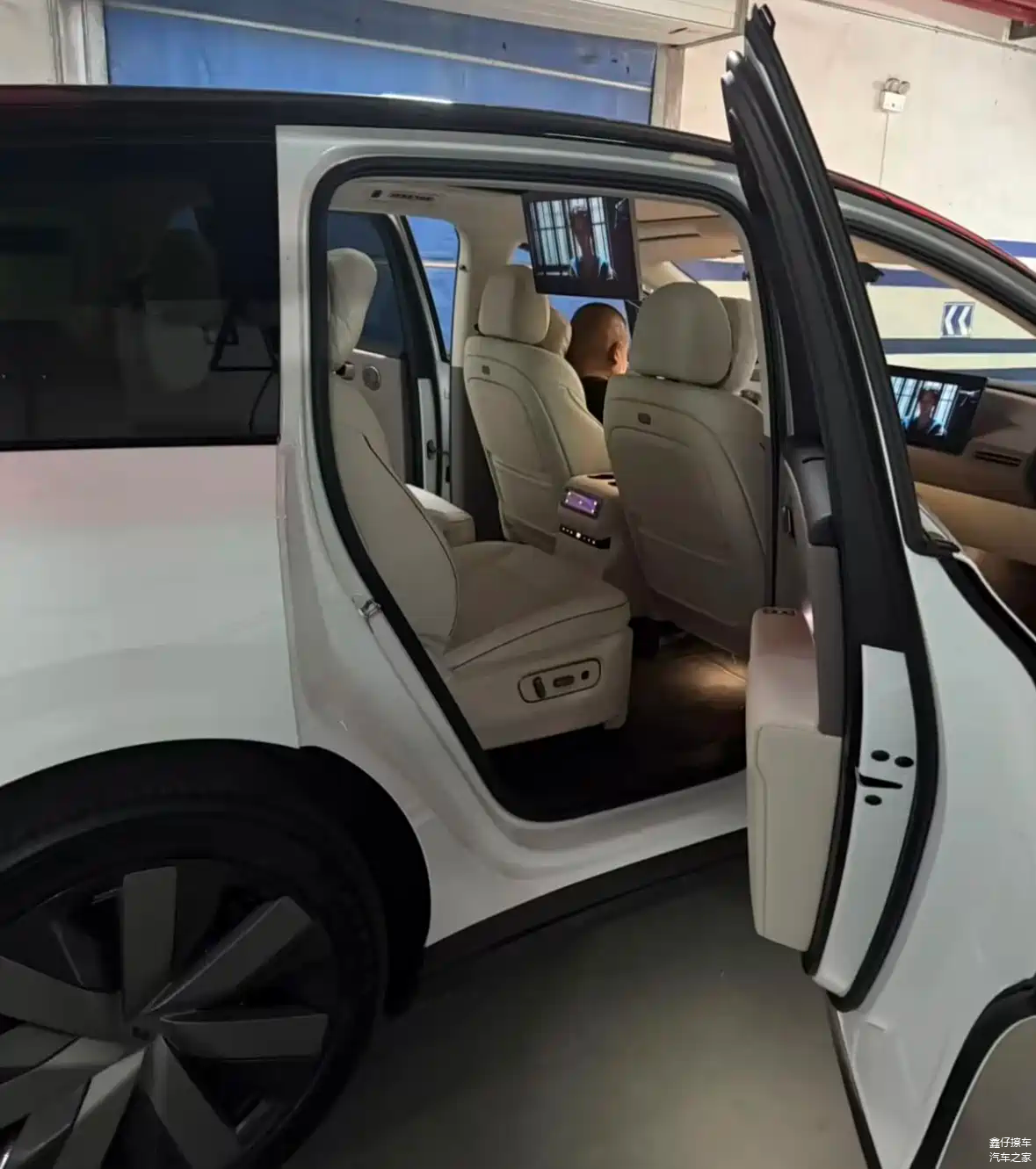 第二排采用两张独立座椅结构,支持电动调节与独立加热/通风功能,每个座椅配备可折叠小桌板,配合中央区域的小尺寸控制屏,为第二排乘员提供车内娱乐、座椅调节等便捷操作方式。车顶侧面设有独立空调出风口,后排还集成尺寸更大的娱乐屏幕,座椅靠背厚度与坐垫长度进一步优化,满足长时间乘坐舒适性需求。