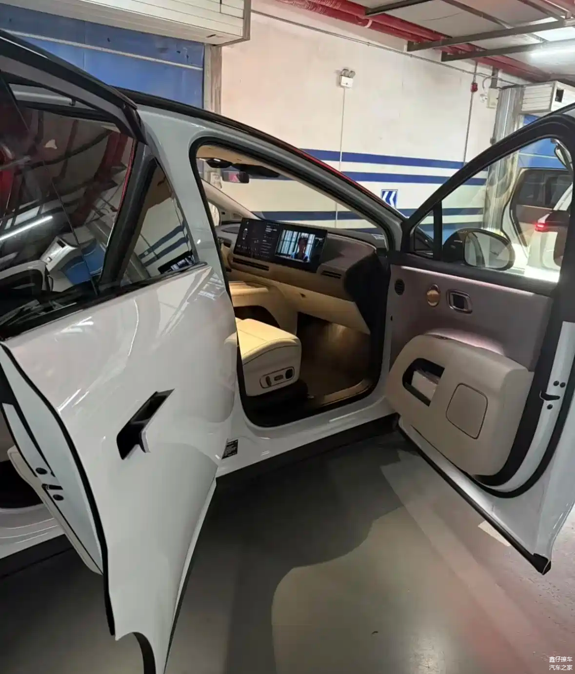 车内维持“主驾屏+副驾屏”组合方式,但依旧取消了传统仪表盘设计,预计通过方向盘前方的显示屏与抬头显示系统(HUD)联合完成信息投射。中央扶手箱区域较为宽大,除了承载储物与车载冰箱功能之外,也整合了无线充电模块以及隐藏式物理控制面板。