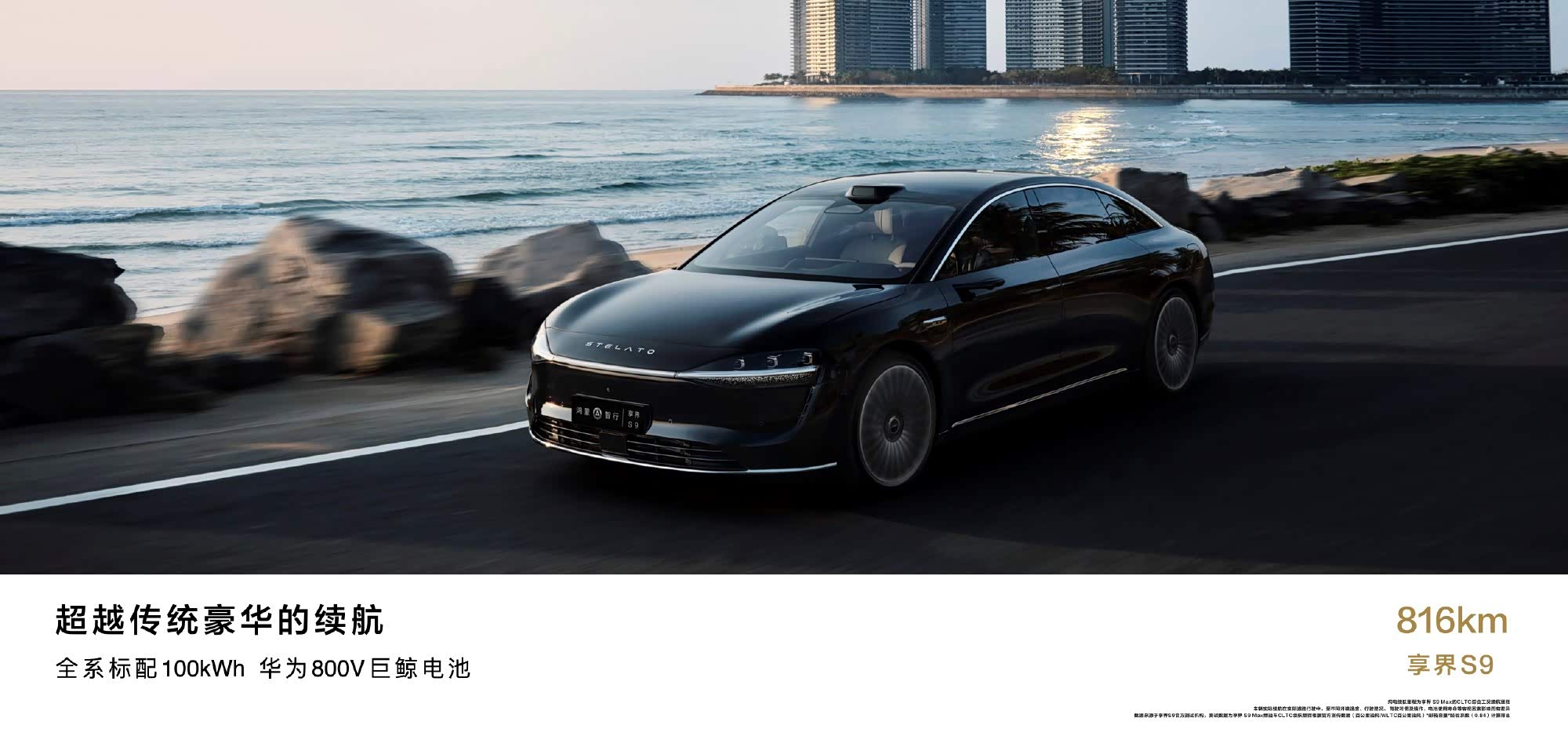享界S9纯电版提供单电机后驱和双电机四驱可选,其中后驱版搭载最大功率227千瓦驱动电机,峰值扭矩为396牛·米,百公里加速5.98秒;四驱版系统综合功率385千瓦,综合扭矩673牛·米,百公里加速3.9秒。续航上,全系匹配100千瓦时电池组,CLTC纯电续航分为816km和721km。