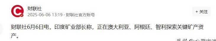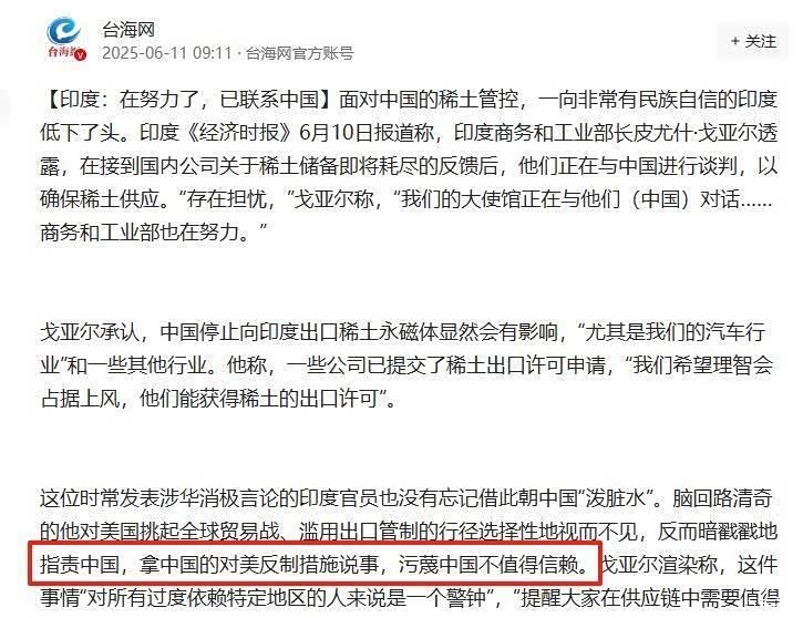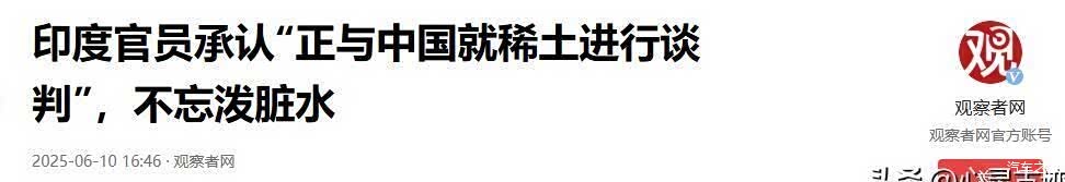 6月10日,印度商务部长戈亚尔公开承认:"我们急需与中国谈判解决稀土供应。 "转头却在记者会上暗示中国"不可靠",甚至搬出"供应链警钟"理论教育全球。 印度网民都看不下去:"求人还摆谱? "
