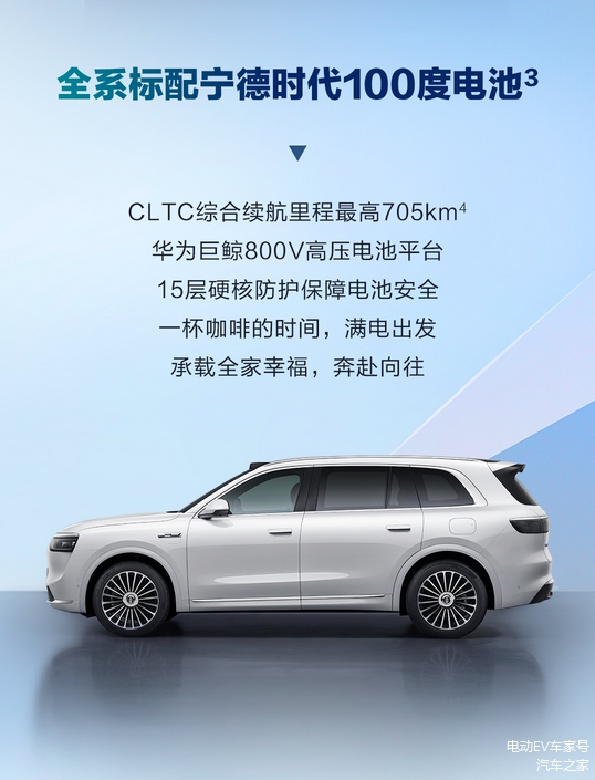 电驱与电池方面,全系标配华为高压七合一电驱和 800V 巨鲸高压电池平台,CLTC 续航最高达 705km。800V 平台的优势不仅在于续航,更在于补能效率,一杯咖啡的时间(约 15 分钟)就能充至 80%,彻底告别续航焦虑。宁德时代 100 度电池的加持,加上华为的 BMS 电池管理系统,安全性和耐久性都有保障。这种技术组合,让纯电版在性能和实用性上达到了完美平衡。