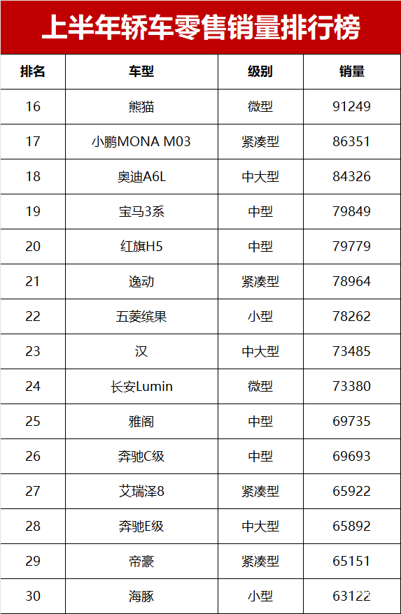 前三甲均为自主新能源车型,合计销量达550916辆,占上半年轿车总销量的10.4%。这一数据直观反映出,10万以下新能源轿车已成为家庭首购和短途通勤的主流选择。值得注意的是,微型新能源轿车中,熊猫以91249辆位列第16,长安Lumin以73380辆排第24,加上宏光MINIEV,三款车型累计销量突破33万辆,占据微型车市场72%的份额。