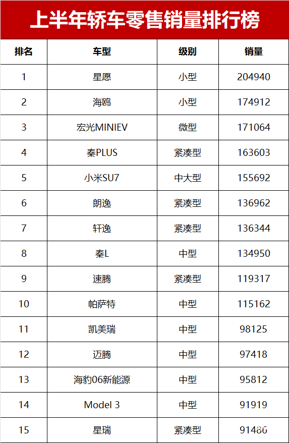 上半年轿车销量冠军由自主品牌星愿摘得,这款小型新能源轿车以204940辆的成绩领跑全场。紧随其后的是比亚迪海鸥,174912辆的零售销量延续了其在小型新能源市场的强势表现;五菱宏光MINIEV以171064辆位列第三,仍是微型车市场的标杆产品。