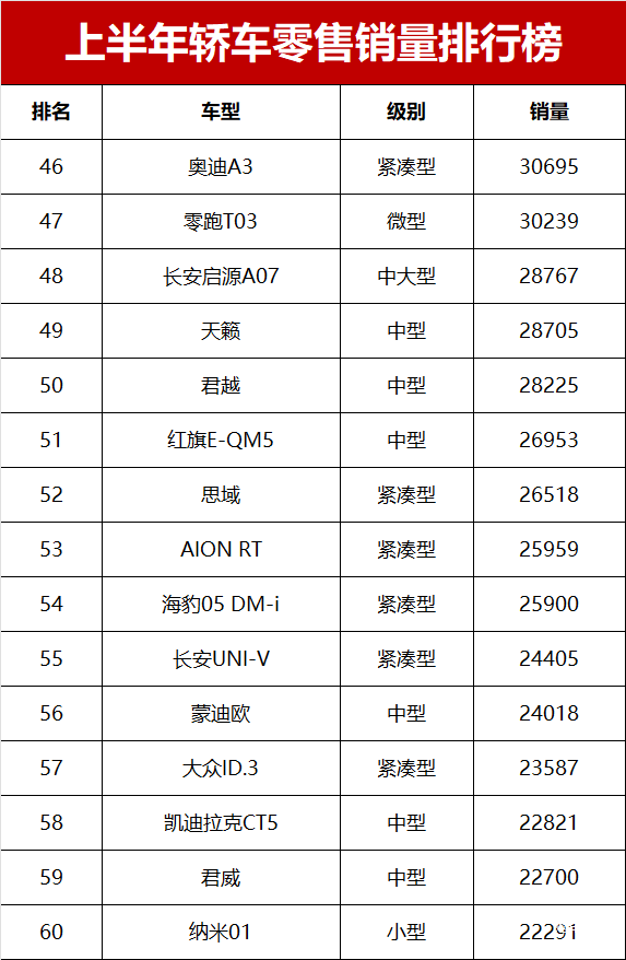 从能源类型看,上半年新能源轿车前100名中占比达58%,其中自主品牌新能源车型占42席,合资新能源仅16席。特斯拉MODEL 3以91919辆排第14,是合资新能源的最高排名;大众ID.3以23587辆列第57,宝马i3销量13151辆居第78,反映出合资品牌在电动化转型上的滞后。