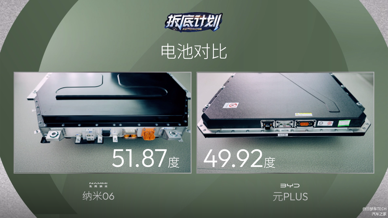 电池层面的差异藏在 “数据细节” 里,纳米 06 搭载 51.87 度电池,元 PLUS 为 49.92 度,两者容量仅差 1.95 度,但 CLTC 续航却相差 40km(纳米 06 510km vs 元 PLUS 470km)。