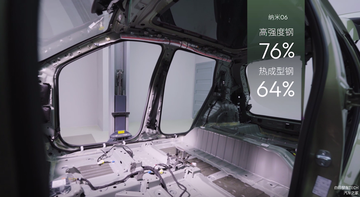 热成型钢的核心价值在于 “更轻的重量实现更高强度”,在车身关键部位,比如 A 柱、B 柱及底盘纵梁,纳米 06 的热成型钢抗拉强度可达 1500MPa 以上,相当于一平方厘米面积能承受 15 吨压力。