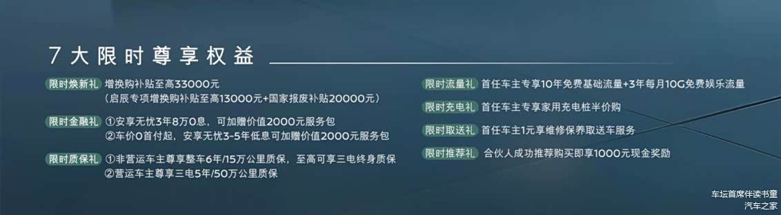 特别值得一提的是,消费者即日起下订并于2025年8月31日(含)前交车,可享全方位权益。具体包括:非营运车主尊享整车6年/15万公里质保,至高可享三电终身质保;首任车主专享10年免费基础流量+3年每月10G免费娱乐流量;增换购补贴至高33000元等。