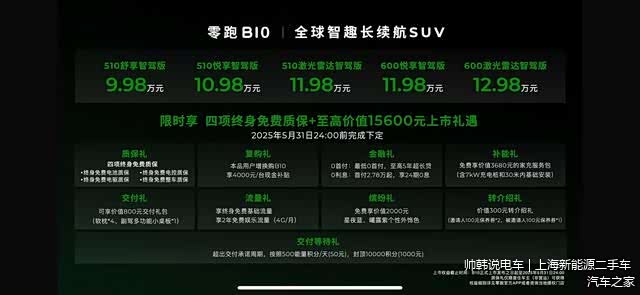 日前, 零跑B10(图片 | 参数 | 询价)正式上市,新车推出5款车型可选,售价区间9.98-12.98万元。此次,新车基于LEAP 3.5架构B平台打造,并标配800V架构,且带来8295芯片、激光雷达等配置,CLTC续航里程最高600km。