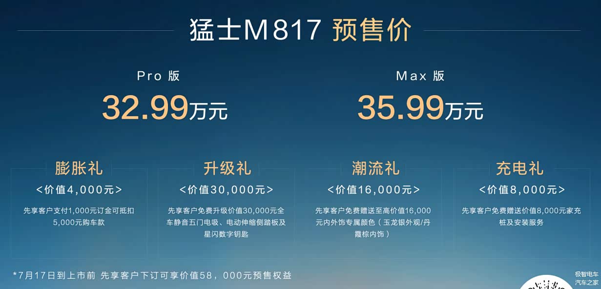 新能源浪潮下,硬派越野正从 “机械硬核” 转向 “智能全域”。7 月 17 日,猛士与华为联手打造的豪华智能越野 SUV—— 猛士 M817 开启预售:Pro 版 32.99 万、Max 版 35.99 万,即日起订享 5.8 万元限时权益。