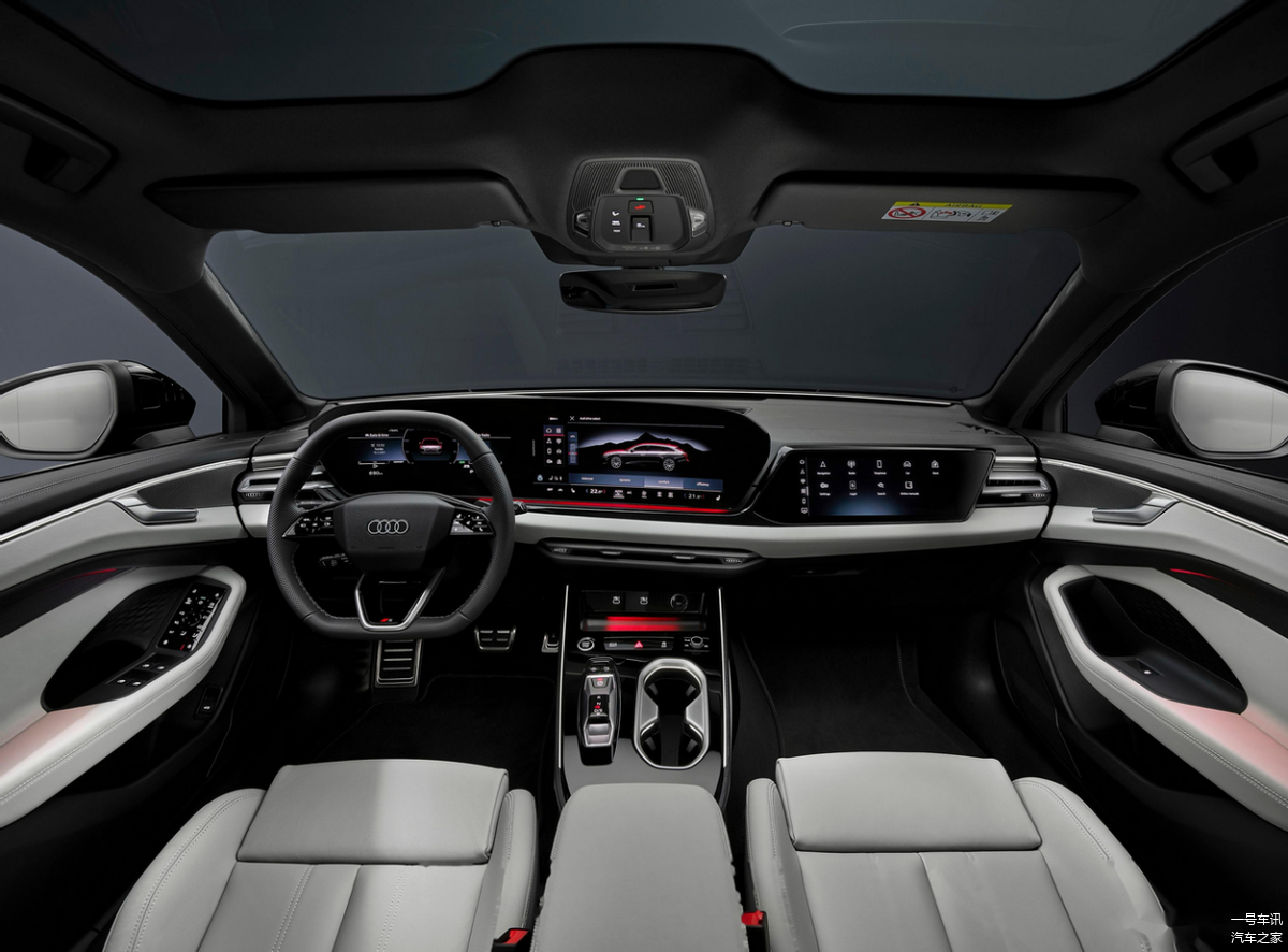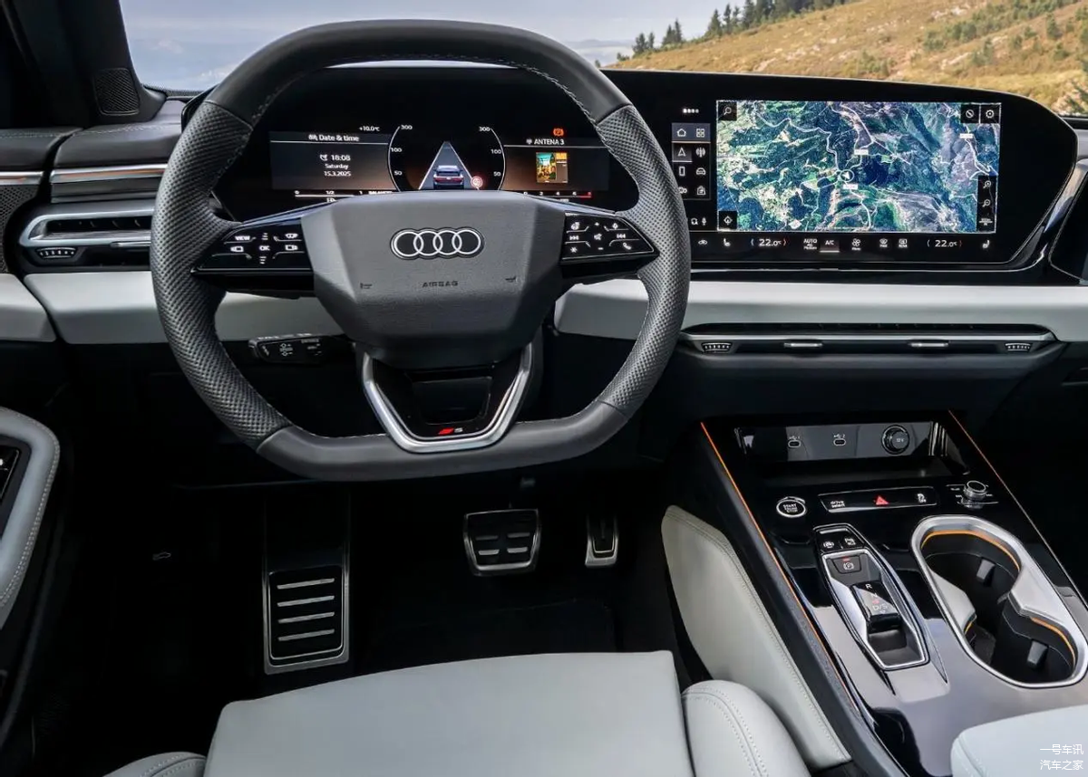 座舱的革新最能体现奥迪对未来的理解。环抱式结构中,11.9 英寸全液晶仪表与 14.5 英寸中控屏组成曲面连屏,副驾 10.9 英寸娱乐屏的加入则兼顾了乘坐体验。四辐式多功能方向盘借鉴自 Q 系列 e-tron 车型,这种电动化元素的 "下放",暗示着燃油车型与纯电平台的技术融合。