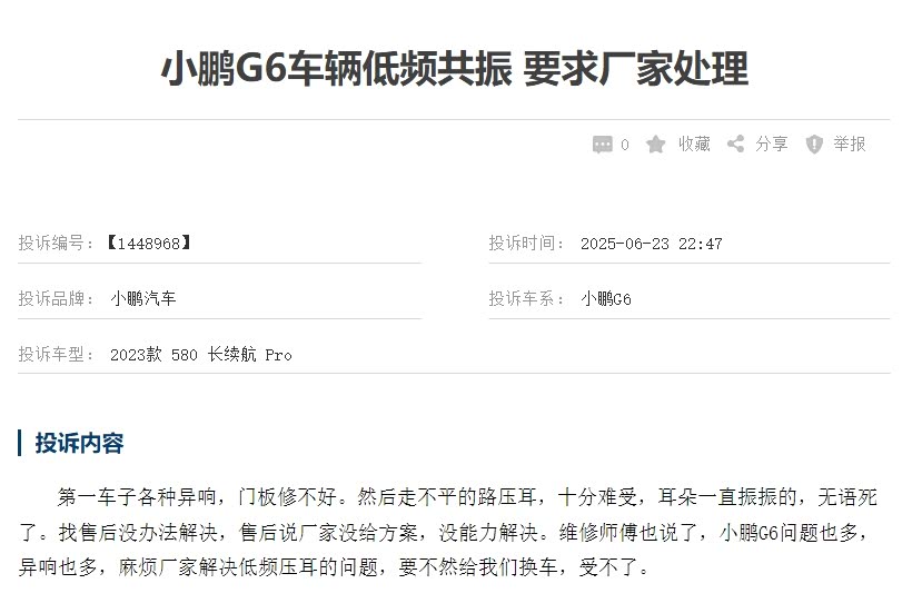 此外,不少车主反馈,小鹏G6存在低频压耳的问题。即车内低频共振,出现耳鸣的现象,耳部会很不舒服,主要出现在颠簸路面,部分车主反映铺装路面也存在。这种问题,小鹏MONA M03也同样存在,不少车主也组建了相关维权群。