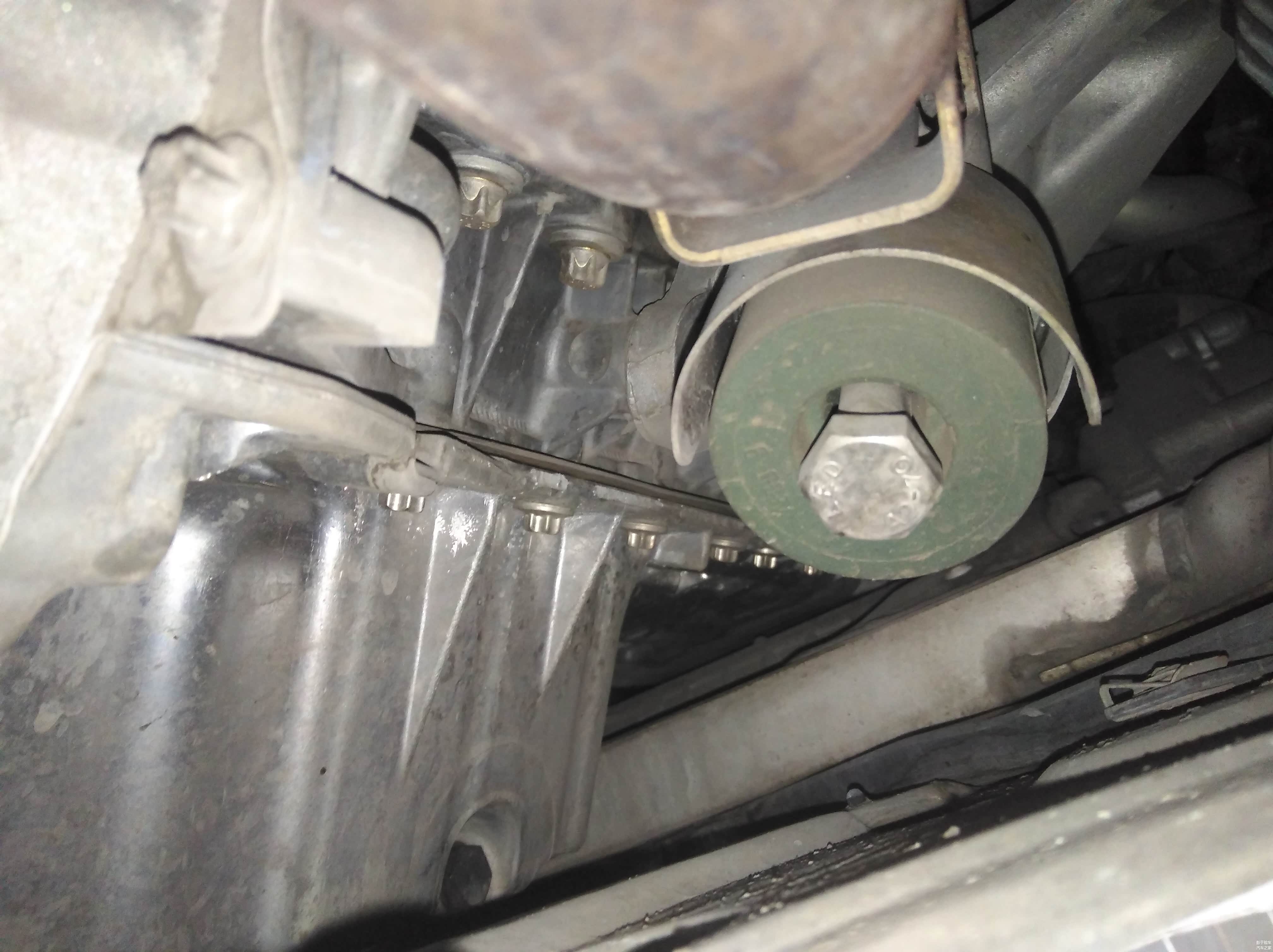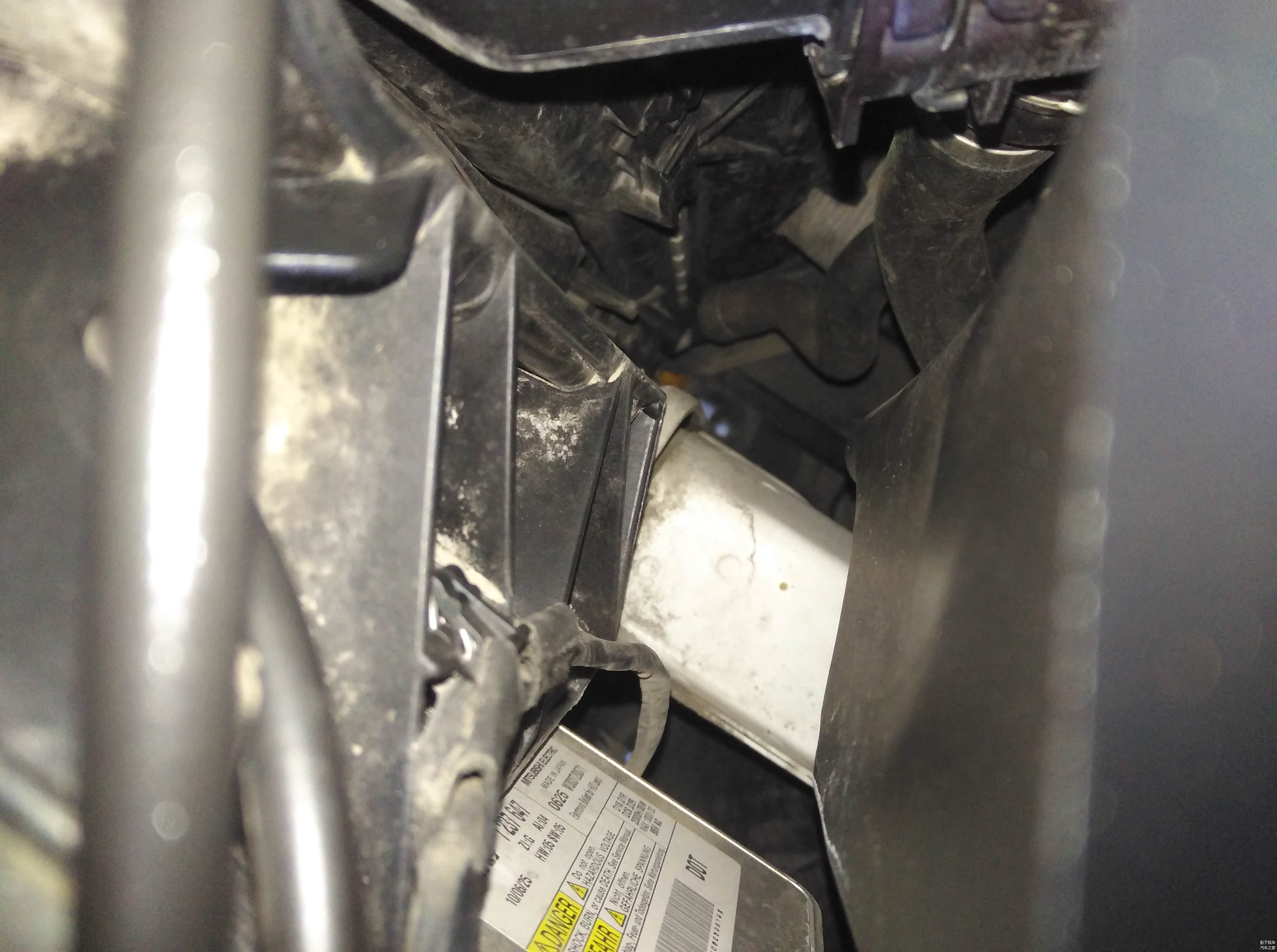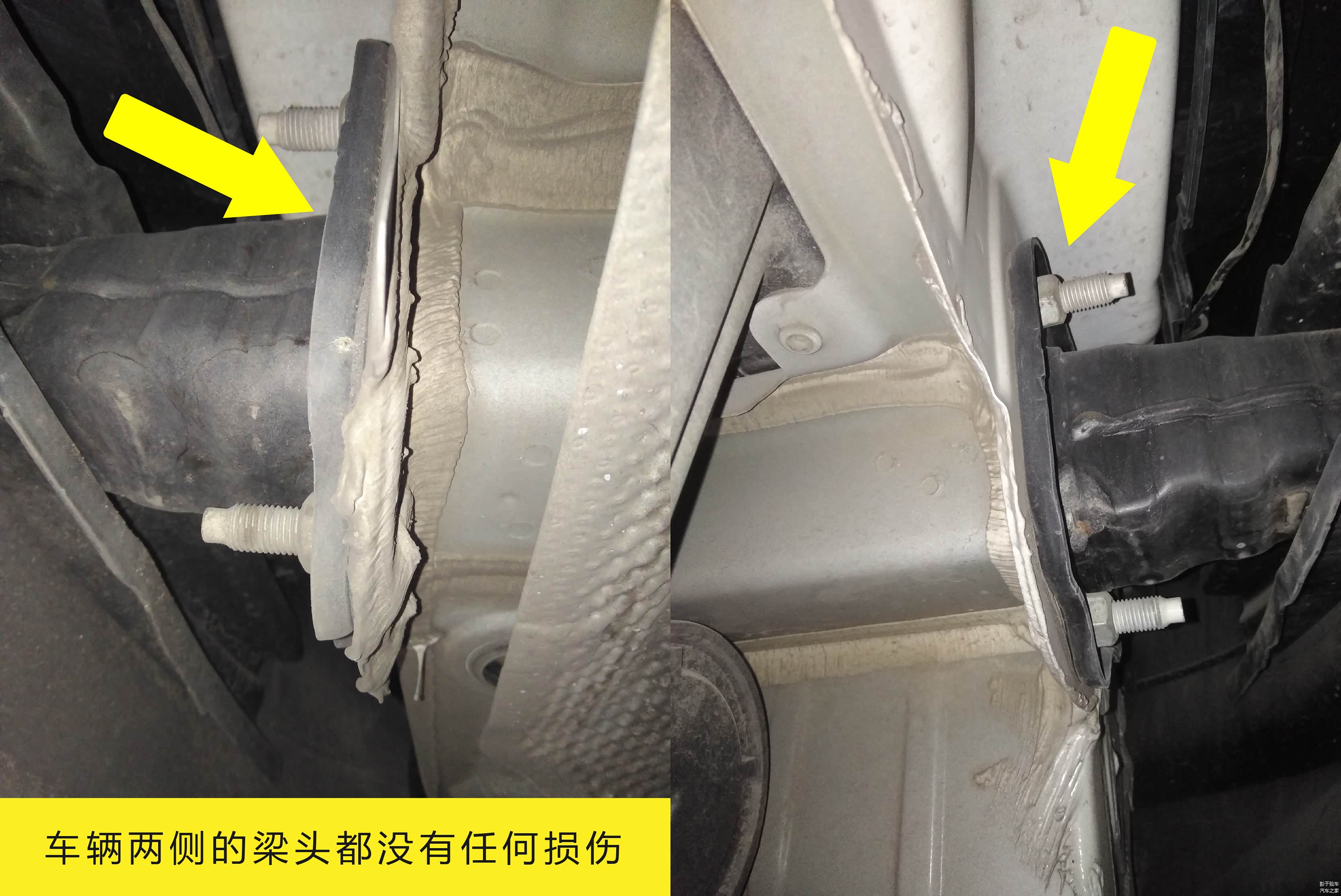 其实从发动机舱就能看到底部的纵梁(图中白色的),这种方法适用于没有抬升条件的小白买家。