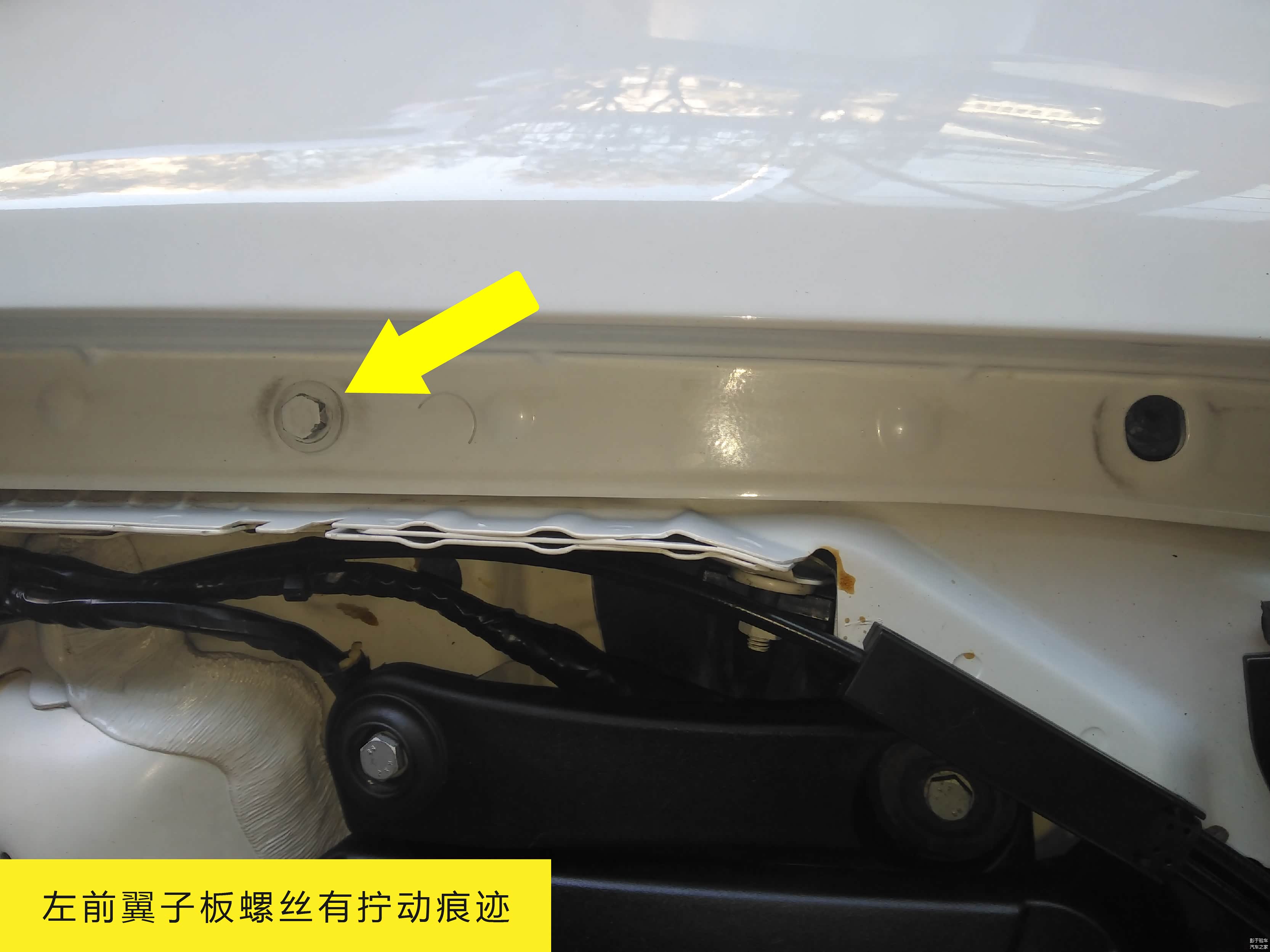 从发动机舱观察,车辆的左前翼子板有拆卸的痕迹,但经过对周围附件的检测没有发现变形修复的情况,应该只是日常小剐蹭所致。