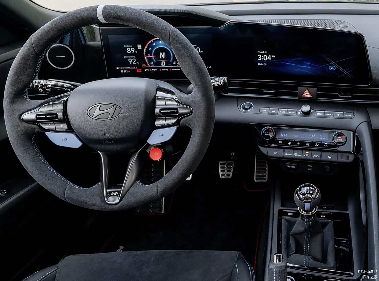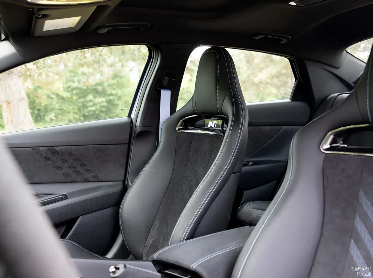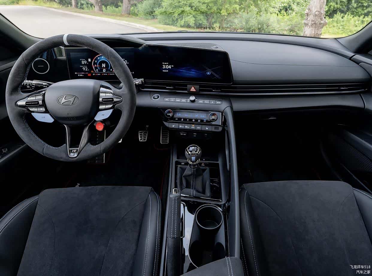 内饰基于伊兰特 N打造,整个环抱式的座舱采用了黑灰色Alcantara面料材质铺陈,还采用了精致的蓝色缝线,再加上贯穿式空调出风口设计、亮黑色钢琴烤漆装饰面板以及大颗粒实体按键,并配备了“N性能”Alcantara方向盘,并带12点钟回正标记和集成在方向盘右侧的红色按钮,营造出更多的赛车驾驶氛围感。前排配备了两个桶装赛车座椅和蓝色安全带,车门槛处使用了N性能金属门槛护板、车内还有N性能脚垫、以及大量的Alcantara内饰套装。操控岛区域配备了经典的圆头手动换挡杆。科技感方面,该车配备了全液晶仪表+大尺寸悬浮式中控屏组成的“错位”连屏设计,并支持Android Auto和苹果CarPlay、OTA升级和语音控制系统。