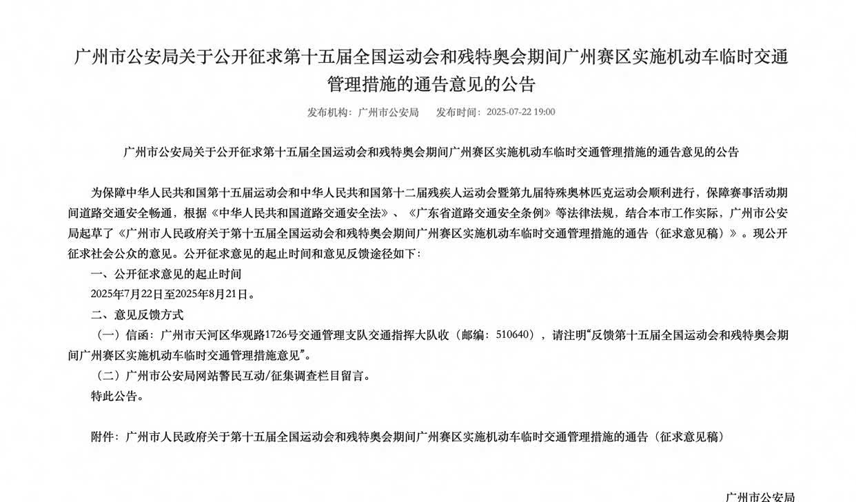 当前征求意见稿中留有协商空间。 例如货车限行时段原计划为全天24小时,经物流协会反馈后调整为7-22时。 市民可通过两种方式发声:向华观路交通指挥大队寄信,或在公安局官网征集调查栏留言。 此前广州亚运会期间,公众建议曾促使地铁末班车延长至凌晨1点。
