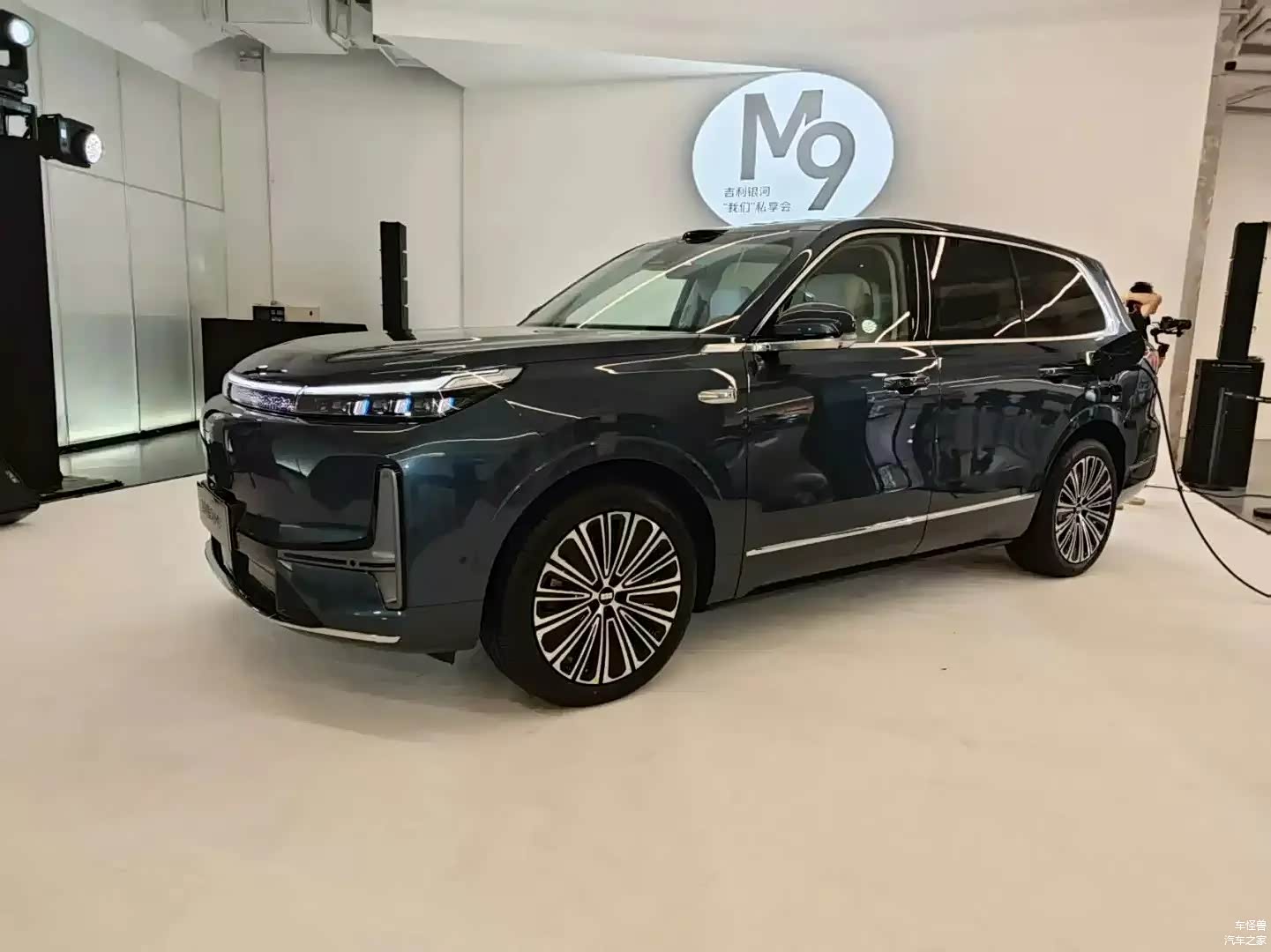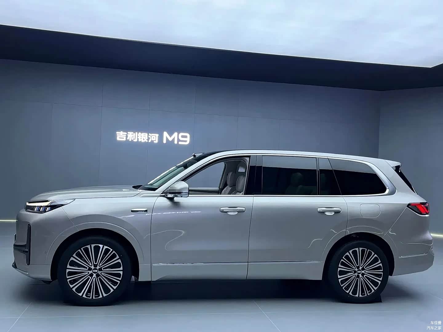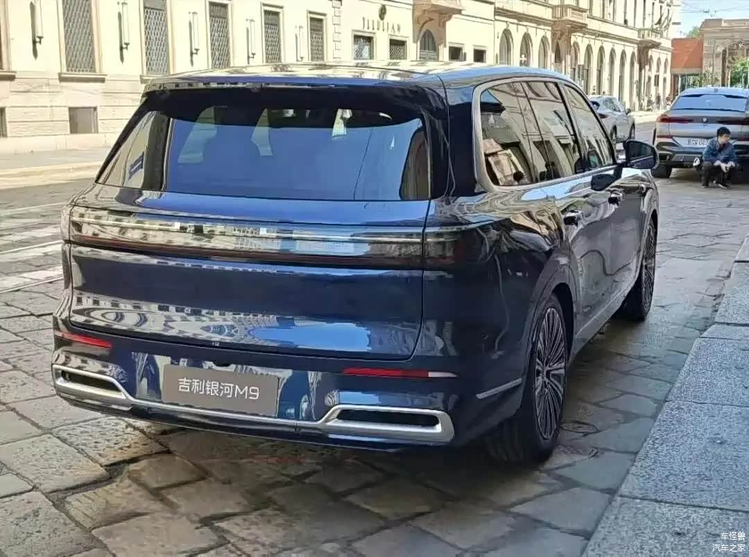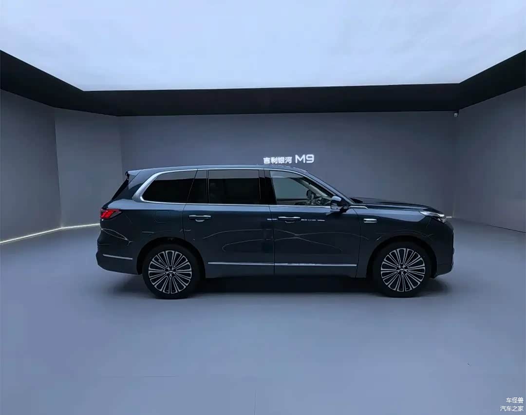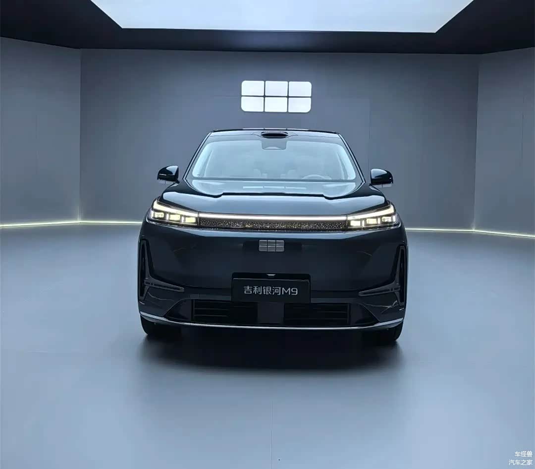 吉利银河M9展现了垂直的前脸造型,其封闭的格栅中心嵌有发光的品牌标志,而贯穿式的LED灯带则在横向上增加了视觉的宽度。矩阵式大灯组巧妙地嵌入了两侧的导风槽区域,并与底部的梯形运动包围和贯穿式镀铬饰条相结合,旨在在维持简约设计风格的同时,也增强了车头的张力。车身的侧面设计以5205mm的车身长度和3030mm的轴距为特点,呈现出一种庞大的体量感。下沉式车顶线条在D柱上形成了尖锐的折角,配合伞状双色轮毂和隐藏式门把手,不仅降低了风阻,还突出了科技美学。车辆的尾部设计采用了前倾的后风挡和分段扰流板,而贯穿式的尾灯组内部则融入了3D晶格纹理。底部的银色护板与扩散器的设计形成了和谐的呼应,整体结构层次清晰且具有很高的辨识度。