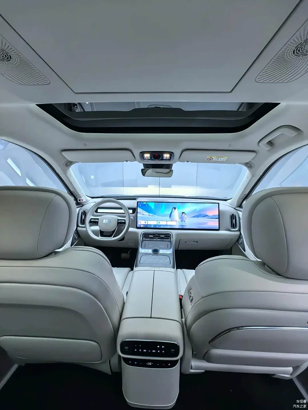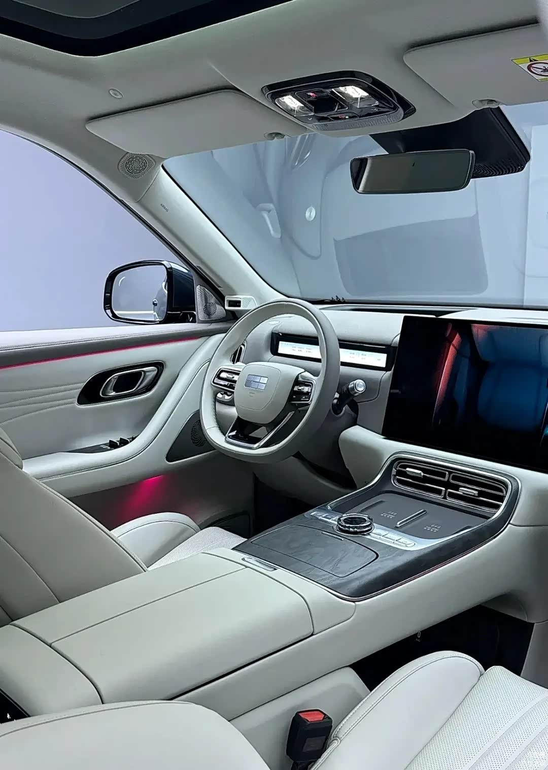 车辆的内部装饰延续了极简主义的设计理念,配备了一个15.4英寸的悬浮式联屏,该联屏向驾驶席倾斜了10度。此外,内部搭载了银河N OS系统和高通8295芯片,能够支持四音区的语音交互和手势控制功能。在主驾驶区域前方,配备了一个10.25英寸的窄屏仪表,该仪表与AR-HUD抬头显示技术相结合,形成了一个三屏联动的视觉效果。整个驾驶舱内都被256色的氛围灯带所环绕,再加上Nappa真皮座椅和天然胡桃木饰板的组合,共同打造出一种融合了科技与豪华元素的驾驶和乘坐体验。在六座版本的第二排中,有一个16.2英寸的吸顶屏,它支持华为HiCar与CarPlay手机的连接,并与16声道雅马哈音响系统相结合,共同构建了一个移动的影音体验空间。