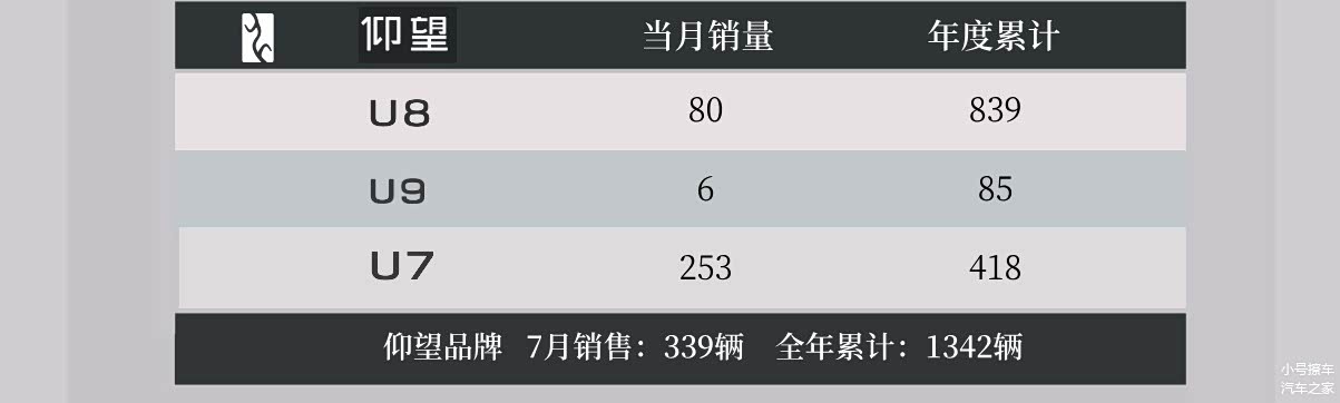 仰望品牌7月份销量339辆,年度累计1342辆,这种百万级的品牌,只要能卖得出去,其实就是成功的,至少证明有一部分消费者还是认可仰望品牌的价值;其中仰望U8在7月份销量80辆,年度累计839辆;仰望U9在7月份销量6辆,年度累计85辆;仰望U7在7月份销量253辆,年度累计418辆。
