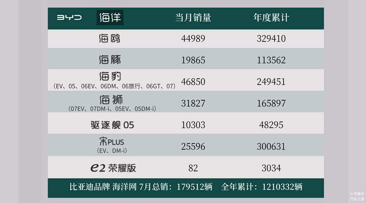 海洋网7月份销量179512辆,年度累计1210332辆,和王朝网相比有一定的优势;其中海鸥7月份销量44989辆,年度累计329410辆,是比亚迪在今年销量表现最好的车型,同样也是海洋网的销量担当;海豚7月份销量19865辆,年度累计113562辆,有那么点销量逐渐复苏的态势了;海豹家族7月份销量46850辆,年度累计249451辆,同样也是相对出色的表现;海狮家族7月份销量31827辆,年度累计165897辆,和王朝网的宋家族相比有一定的优势;驱逐舰05目前还没有停产,7月份销量10303辆,年度累计48295辆,也算是一股不可忽视的力量;宋PLUS家族7月份销量25596辆,和巅峰时刻相比少了一半左右,年度累计销量300631辆,看来智驾版并不是解决问题的最佳办法;e2荣耀版7月份销量82辆,年度累计3034辆,一直都算是聊胜于无的水准。