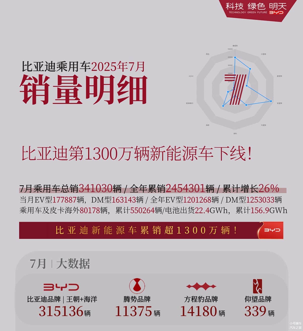 比亚迪刚刚公布了7月份的销量表现,乘用车销量341030辆,其中插混车型163143辆,纯电动车型177887辆,全年累计乘用车销量2454301辆,其中纯电动车型1201268辆,插混车型1253303辆,整体来看依然是插混和纯电两条腿走路的态势。此外,在7月份,比亚迪还完成了第1300万辆新能源车下线仪式。