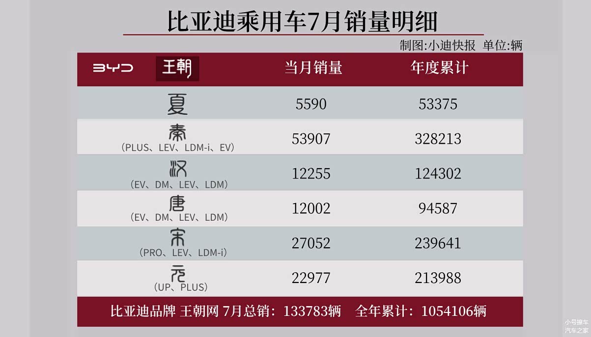 具体到车型方面,王朝网7月份销量133783辆,年度累计1054106辆,其中比亚迪夏7月销量5590辆,年度累计53375辆;秦家族7月份销量53907辆,年度累计328213辆,是7月份比亚迪销量最好的车型,也是旺超市的销量担当;汉家族7月份销量12255辆,年度累计124302辆,作为家族旗舰轿车,这个销量也是能够拿得出手的;唐家族7月份销量12022辆,年度累计94587辆,作为7座车型,不管是唐还是唐L,空间其实都没有太出色的表现,在一定程度上限制了它的销量表现;宋家族7月份销量27052辆,年度累计239641辆,也算是王朝网的主力车型;元家族7月份销量22977辆,年度累计213988辆,同样是相对出色的表现。