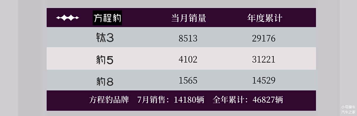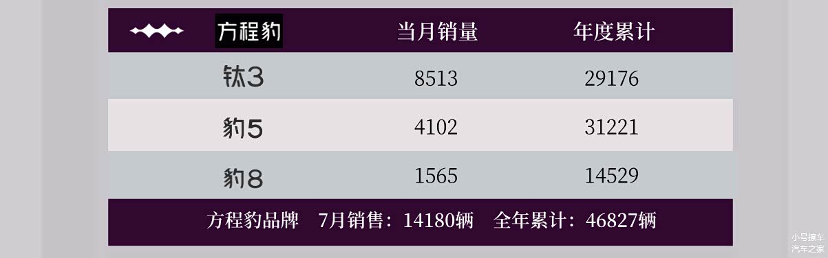 方程豹品牌7月份销量14180辆,年度累计46827辆;其中刚上市的钛3表现依旧抢眼,7月份销量8513辆,年度累计20176辆;豹5在7月份销量4102辆,年度累计31221辆;豹8在7月份销量1565辆,年度累计14529辆。相对来讲,方程豹家族的车型定位还是要小众一些,就看下半年的钛7能有什么样的表现了。