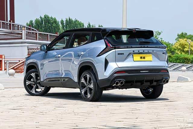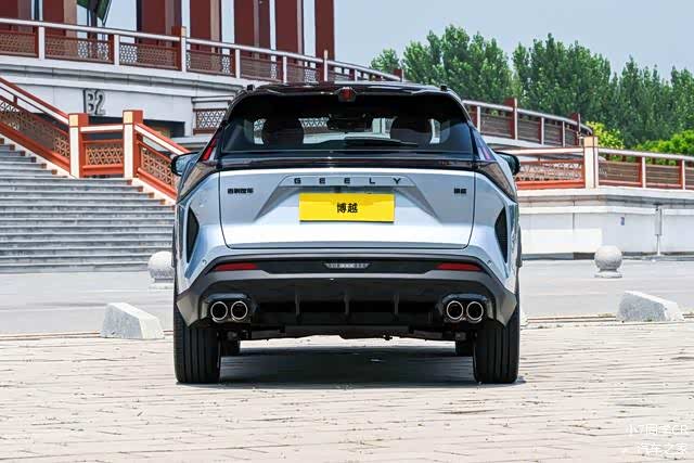 车尾部分,新款(2026款)吉利博越同样保留了老款车型的设计方案,其车尾使用了贯穿式尾灯组、后扰流板+高位刹车灯、后包围大面积熏黑装饰件+扩散器装置+双边共四出排气系统等设计,整体设计动感且时尚。