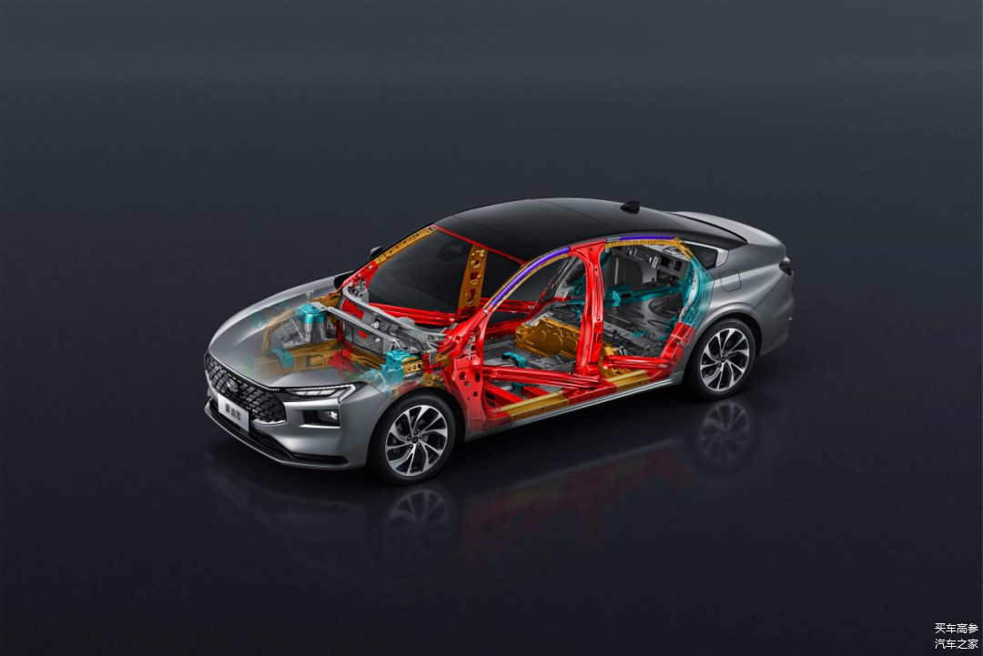 选B级车,安全是最大的豪华。蒙迪欧延续了美系车的钢筋铁骨,在安全方面从没让人失望。它的A柱核心结构“叠了三层甲”,采用三级复合钢材,内层 800Mpa、中间层 1700Mpa(关键承重区)、外层 250Mpa(缓冲层),其中从 A 柱到 C 柱的主承重框架均以 1700Mpa 马氏体钢为核心,车身顶部可以承受8.79吨的重量,可以允许5台蒙迪欧叠罗汉也没问题,对比起同级车普遍的1200MPa高出不少,把B级车安全天花板抬高了一个量级。