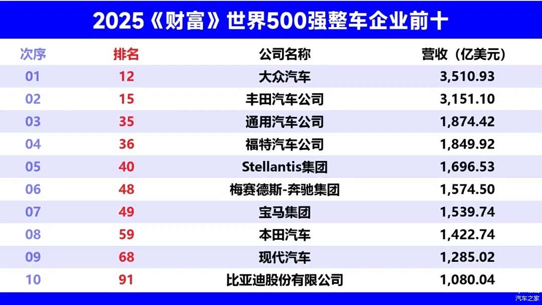 总的来看,2025年《财富》世界500强的榜单揭示了全球汽车产业的新动向。中国企业的崛起、德国大众的引领,以及传统汽车制造商的转型升级,共同为全球汽车格局注入了新的活力。