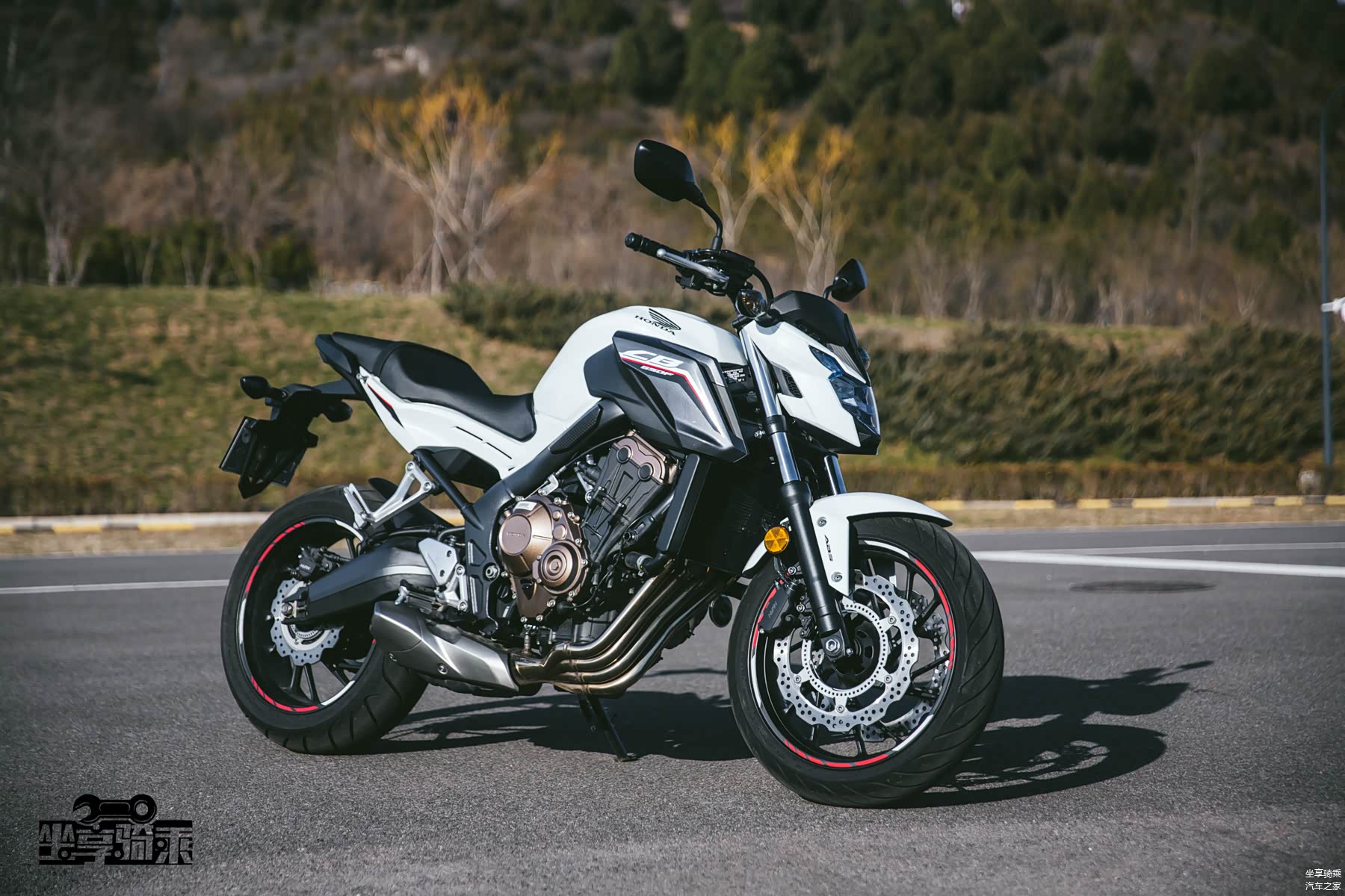 珠光白色车漆在阳光下闪闪发亮,油箱上方印有Honda的鹰翼Logo