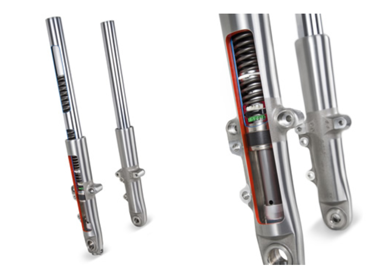 SDBV全称为Showa Dual Bending Valve,可大致译为双弯曲阀门技术。传统前叉通常用单一阀门控制阻尼油流动,从而起到压缩回弹阻尼的作用。而SDBV则通过双阀门分别控制压缩阻尼、回弹阻尼,使得前叉在低速、高速压缩之间阻尼力变化更加线性,增强颠簸路面的滤震性能。同时增加的成本和自重也极低。