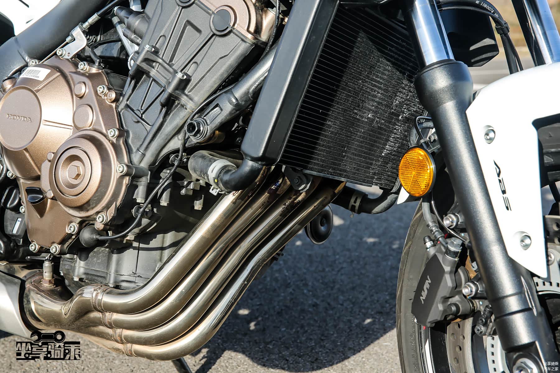 水箱下方并排分布的四根排气歧管相当惹眼,在油底壳位置直接汇集至排气中尾段。这种设计与性能仿赛车型CBR600RR的4-2-1排气布局有所差别,后者可以更好的减少排气干涉,增强排气谐振效应,从而提升排气效率。