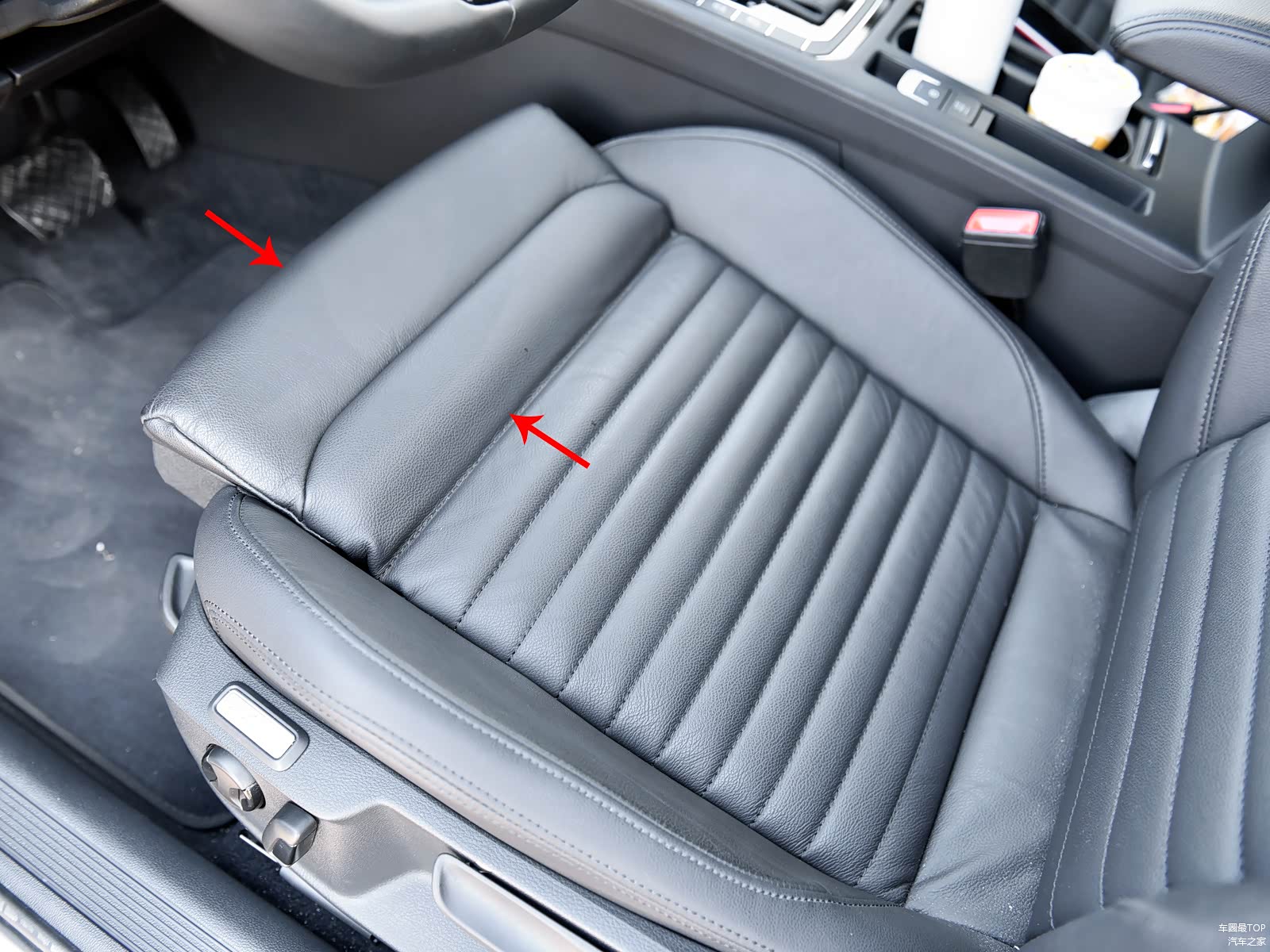 座椅的另一大亮点是可以手动伸长的坐垫,拉长后可以对大腿提供更加充足的支撑(图中红色箭头所指区域)。