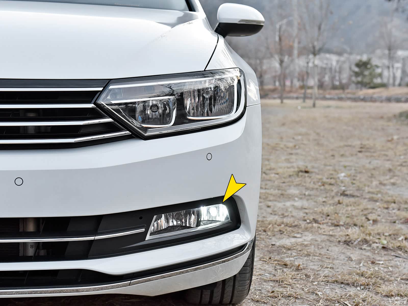 由于我的蔚揽是2.0T“乞丐”版,自然灯光配置也被德国人一撸到底,全部为昏黄的卤素光源,远/近光的发光亮度和夜间照明效果尚能让人认可,但前保险杠两侧的日间行车灯也是卤素的,这就有点太鸡贼了,并且总被停车场大爷在大白天提醒没关灯,这样的尴尬迫使我DIY更换了一对白光的LED灯泡(图中箭头所指),总算跟上了时代的步伐。而比我这个“乞丐”版高一个配置的蔚揽,则全部为LED光源了。