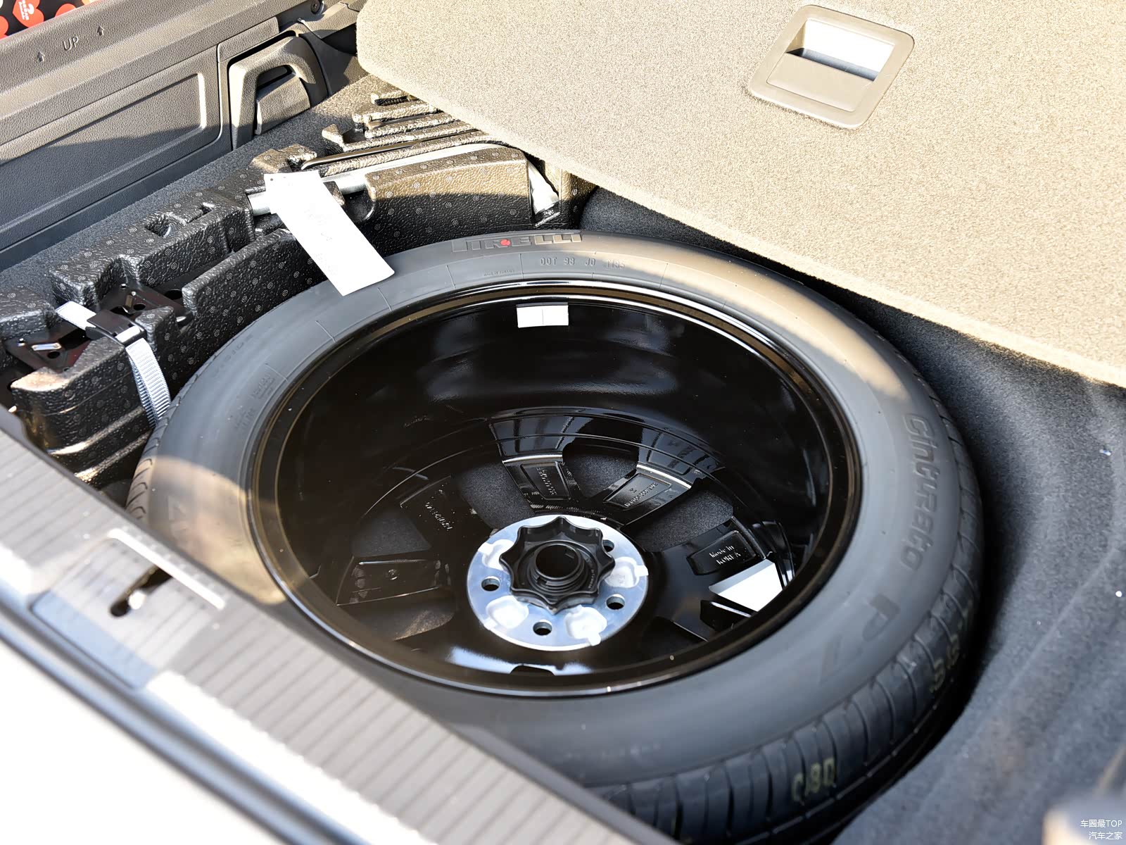 后备厢盖板下部是一条全尺寸备胎,重点是备胎轮圈不是很多车企惯用的廉价钢圈,而是包括轮圈材质/造型、轮胎品牌/规格都和四条正常轮胎一致,真是很难get德国人的设计理念。