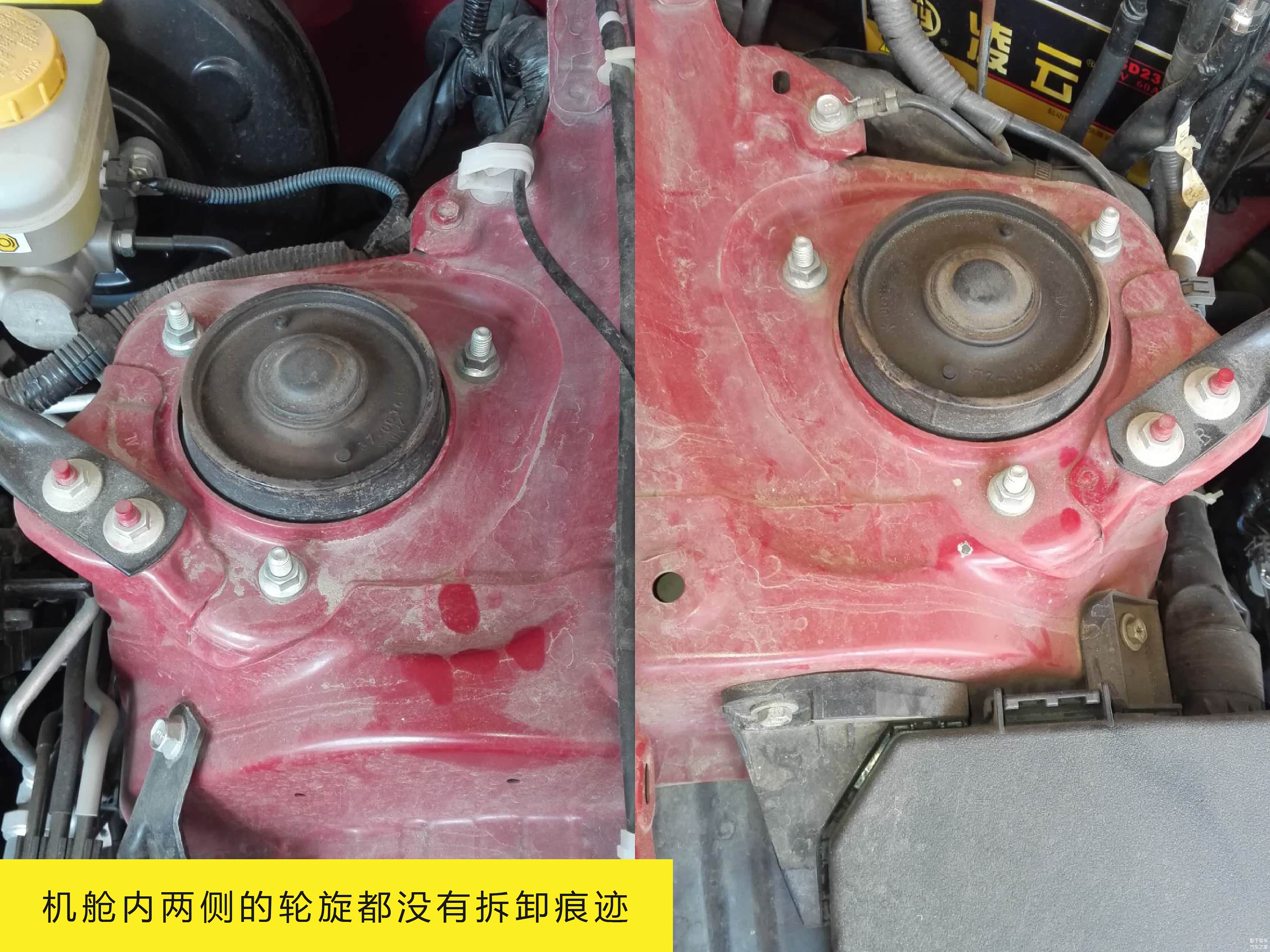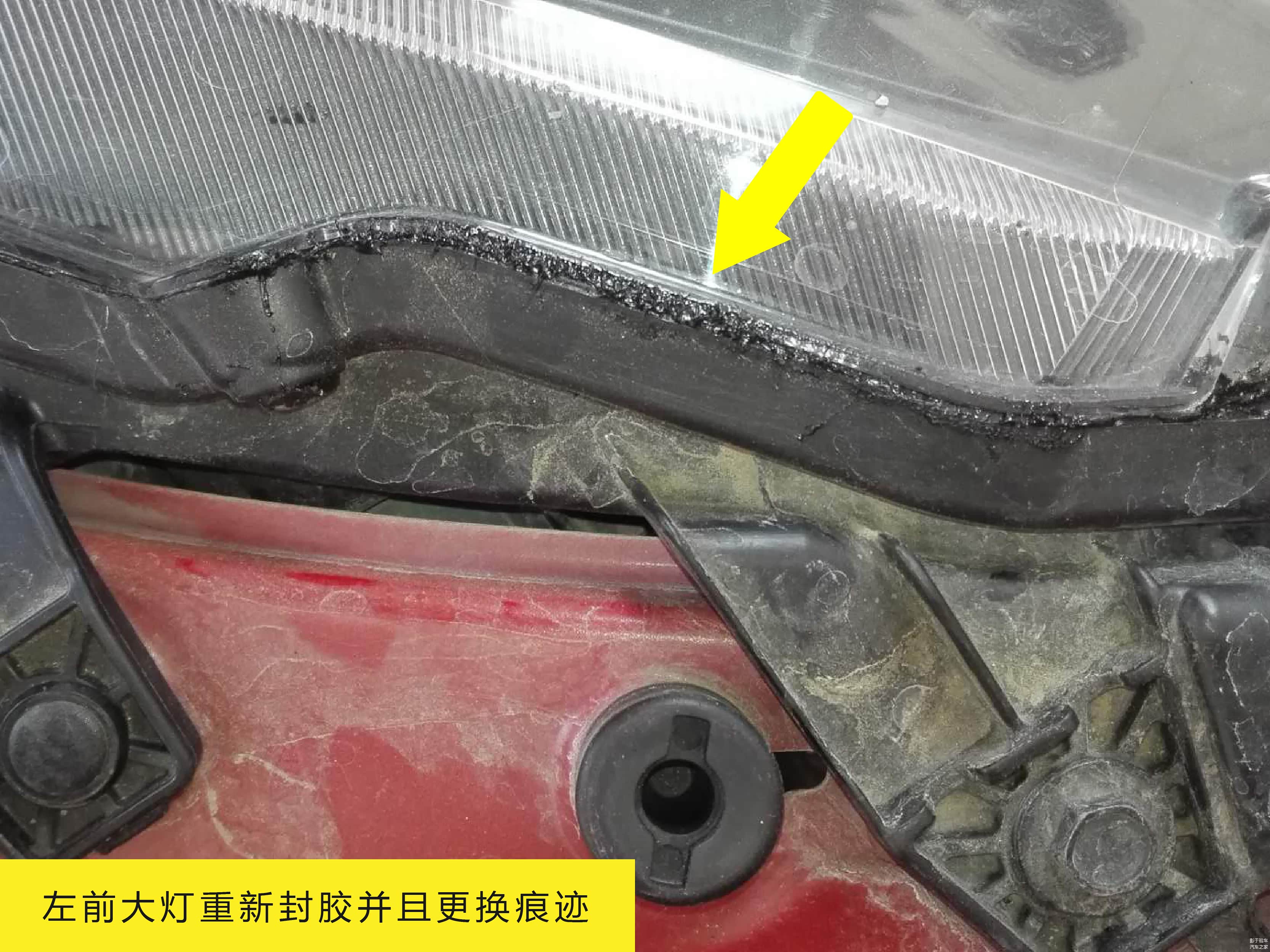 打开车辆的发动机舱,能清楚的看出左前大灯重新封胶痕迹,并且在缝隙处观察大灯生产日期也要晚于出厂日期(拍不清楚,就不跟大家展示了),所以左前大灯应该是撞击更换过。